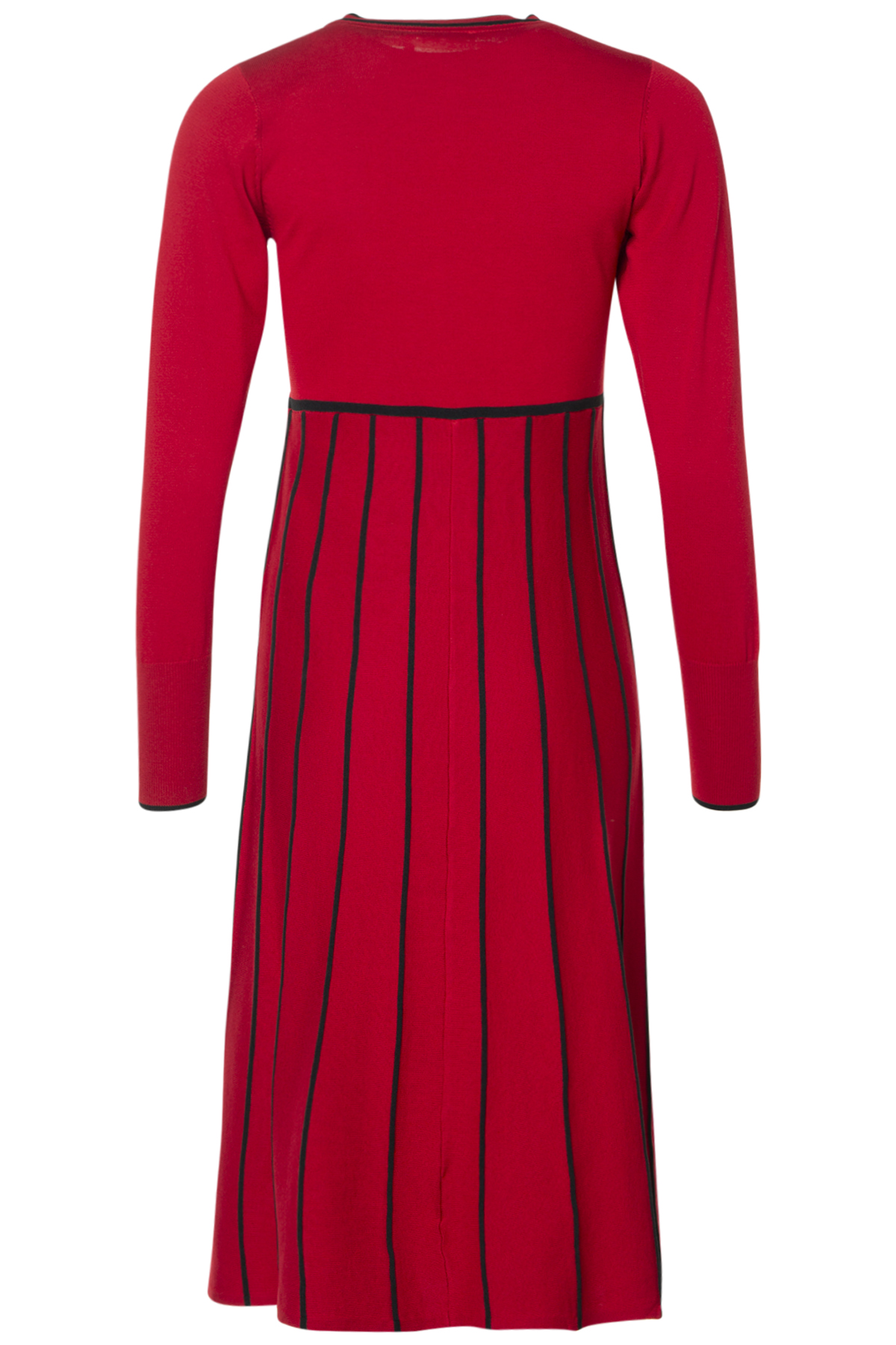 Micha Klänning Imsil är en elegant, finstickad klänning med rund hals och långa ärmar. Den figurnära passformen framhäver silhuetten, medan den lätt utställda kjoldelen ger rörelsefrihet och en smickrande look.
