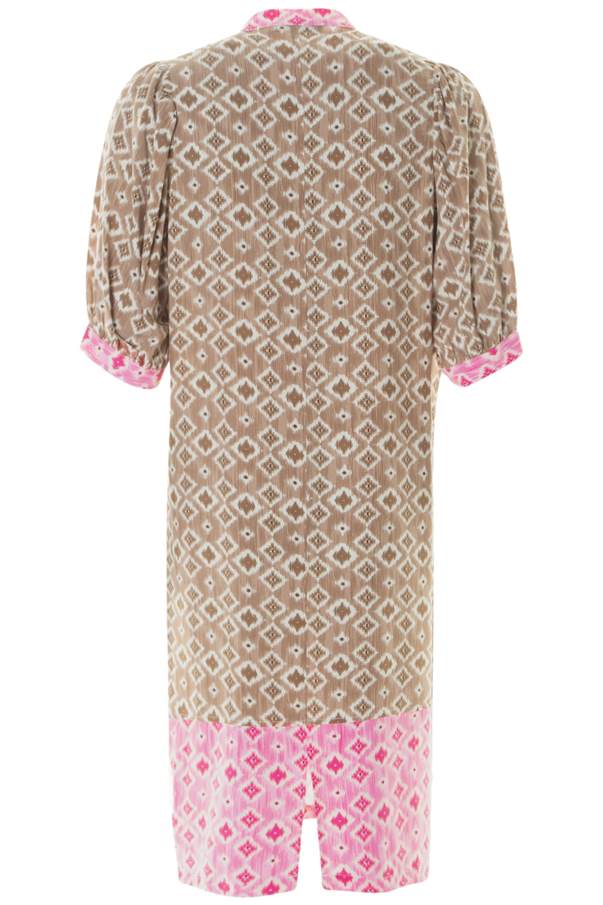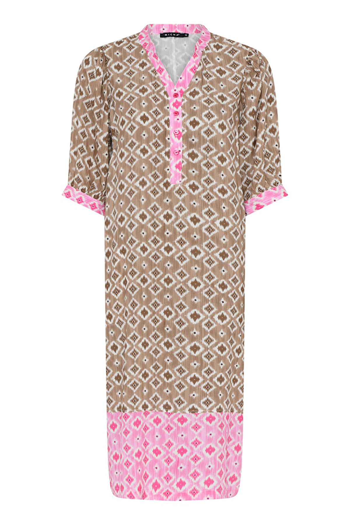 V-ringad mönstrad klänning från Micha med kort ärm. Klänningen är aningens figursydd med insnitt vid bysten och rak i modellen. Knäpps med fyra knappar framtill och klänningen har rynkor på axeln samt en mindre variant av ballongärm. Sidfickor och i mitten längst ner på klänningens baksida finns en kort slits.