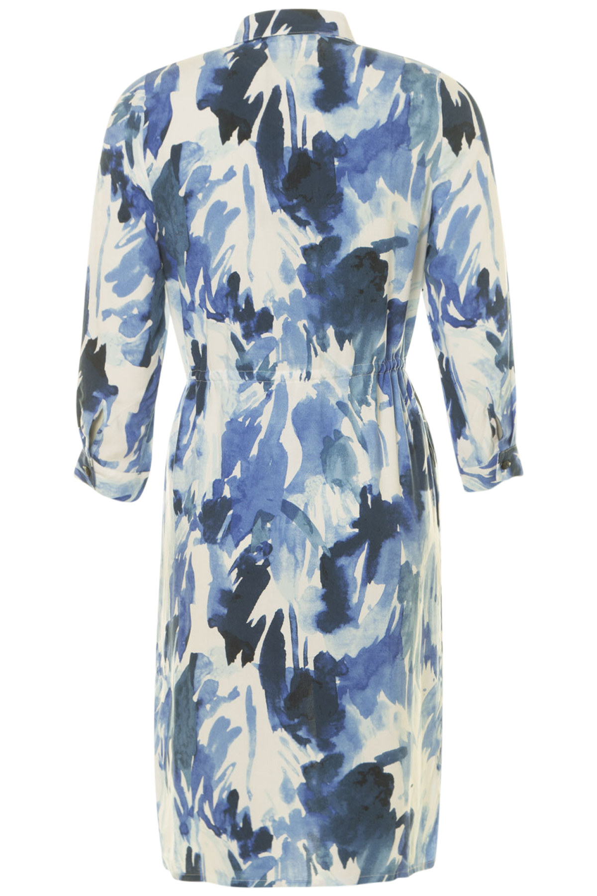 En lite längre klänning i vackert blått mönster från Micha. Klänningen är rak i modellen med en dragsko och knytband i midjan. Den har skjortkrage och nio knappar fram och är tillverkad i en sval och supermjuk viskos.