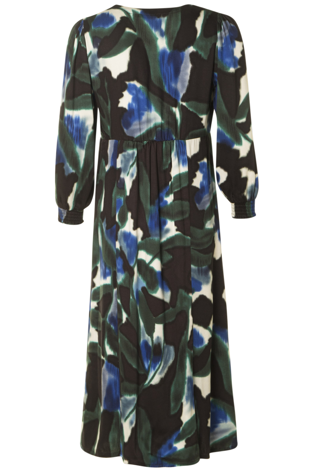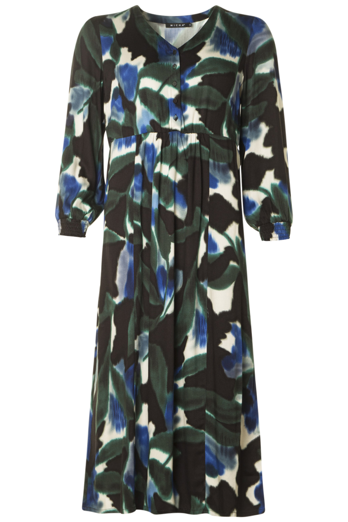 En härlig V-ringad klänning från Micha med 7/8-ärm och fem klädda knappar fram. Klänningen är avskuren i midjan och har lite mer vidd nedtill. Den har smockresår nertill på ärmarna och är tillverkad av en sval och skön viskos.