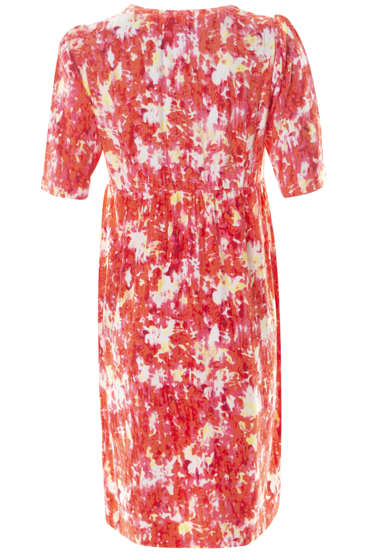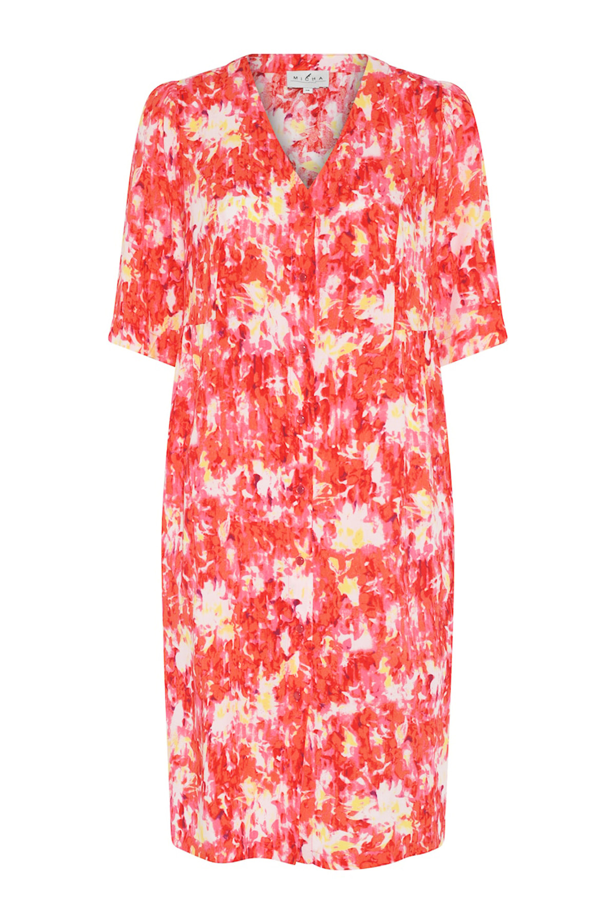 V-ringad mönstrad klänning från Micha med kort ärm. Klänningen är aningens figursydd och har rynkor på axeln som fin detalj. Knäpps med nio knappar framtill.