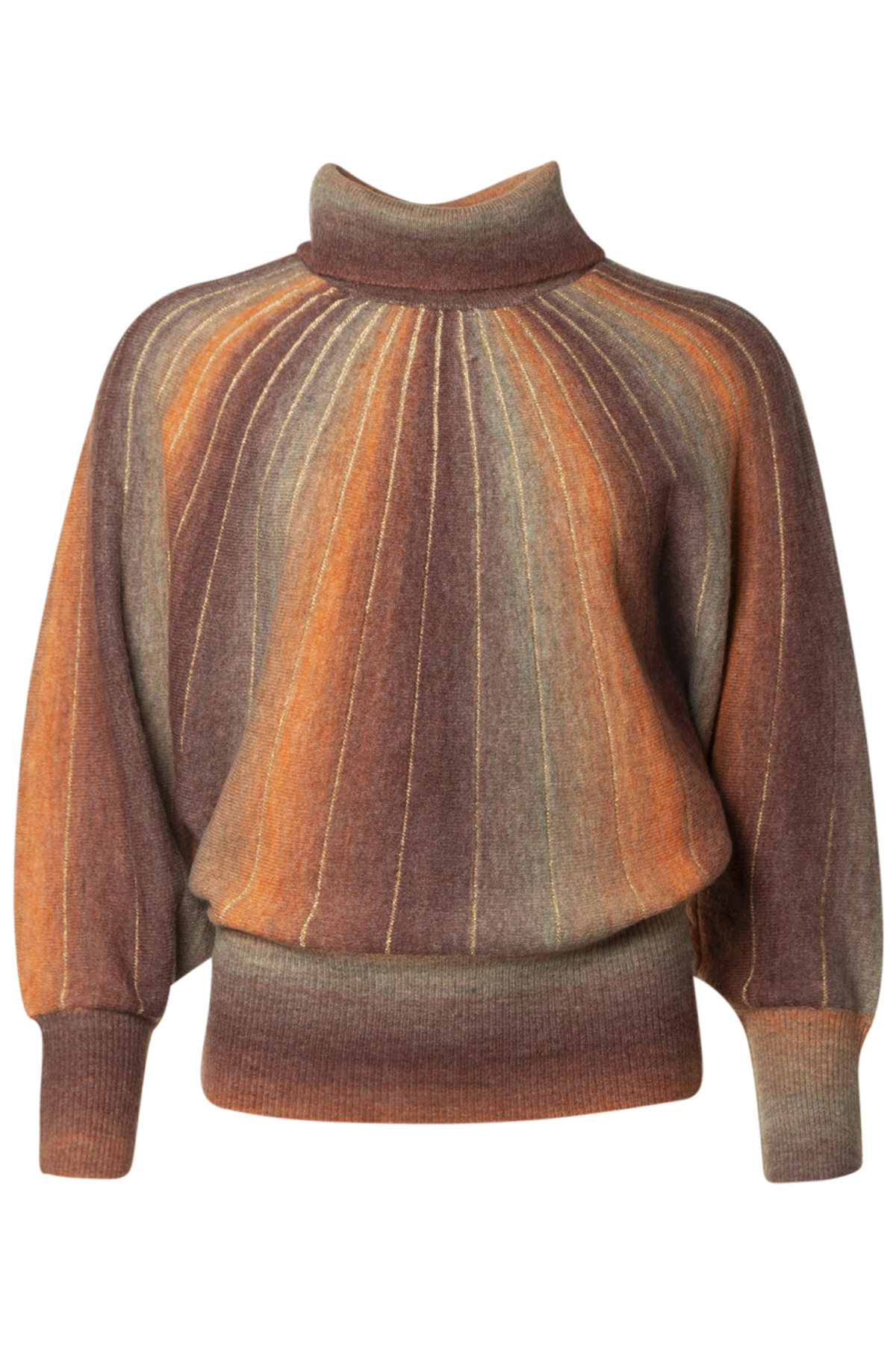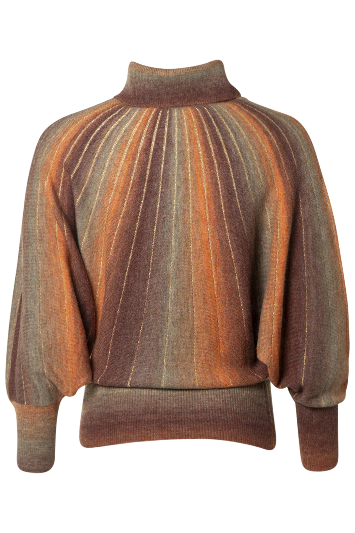 Micha PoloTröja Muju. En elegant mjuk tröja med polo-krage och lång pingvinärm från Micha. Tröjan är rymlig i modellen, normal i passformen och har en bred mudd nedtill. Tröjan har ett fint långrandigt mönster i varma toner, samt en diskret glittertråd. Tröjan är tillverkad av en varm och skön viskosmix med lite ull.