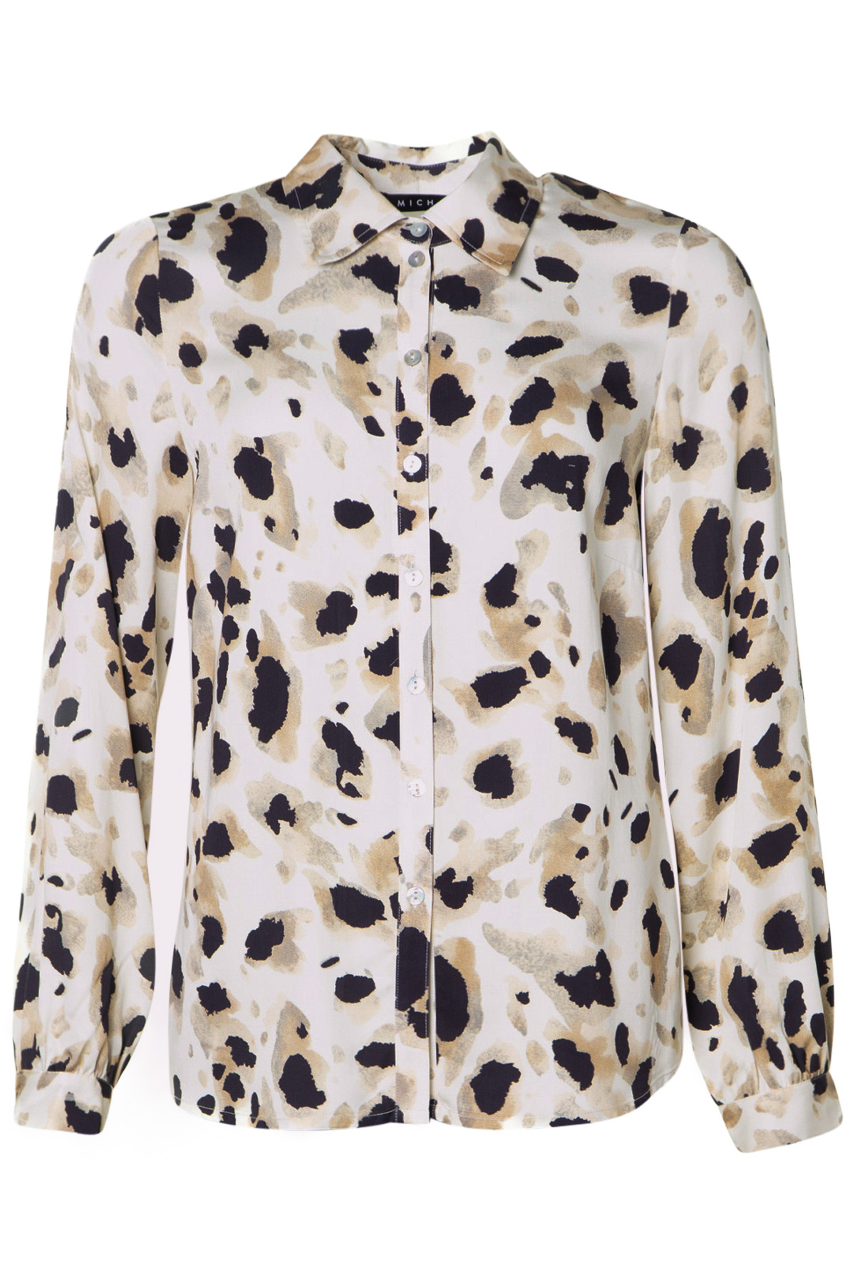 Micha Skjorta Icheon är en en elegant mönstrad blus från Micha med lång ärm. Blusen har klassisk skjortkrage och knäpps med åtta pärlemor-knappar fram. Blusen är rak i modellen och rymlig i passformen, samt har insnitt vid bysten och små sprund i sidorna. Den är tillverkad av en sidenmjuk sval viskos.