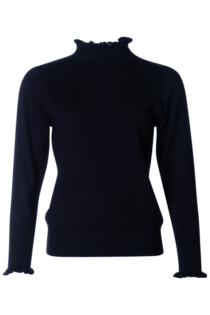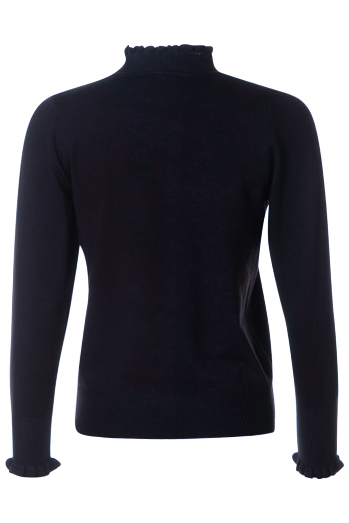 Polokragen är ribbstickad och den har muddar runt ärmsluten och nedtill.