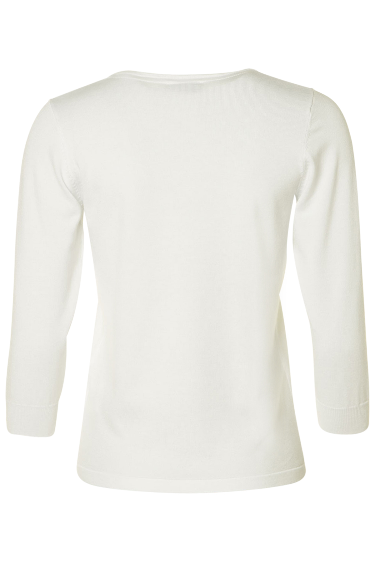 Micha Tröja Estepona är en mjuk slätstickad tröja med 3/4-ärm från Micha med rund hals. Koftan är rak i modellen och normal i passformen med ett dekorativt ribbsickat parti med blanka guldfärgade knappar, från halsringningen och ett likadant parti nedtill på ärmar. Tröjan är tillverkad av en lätt och mjuk viskosmix med mycket stretch.