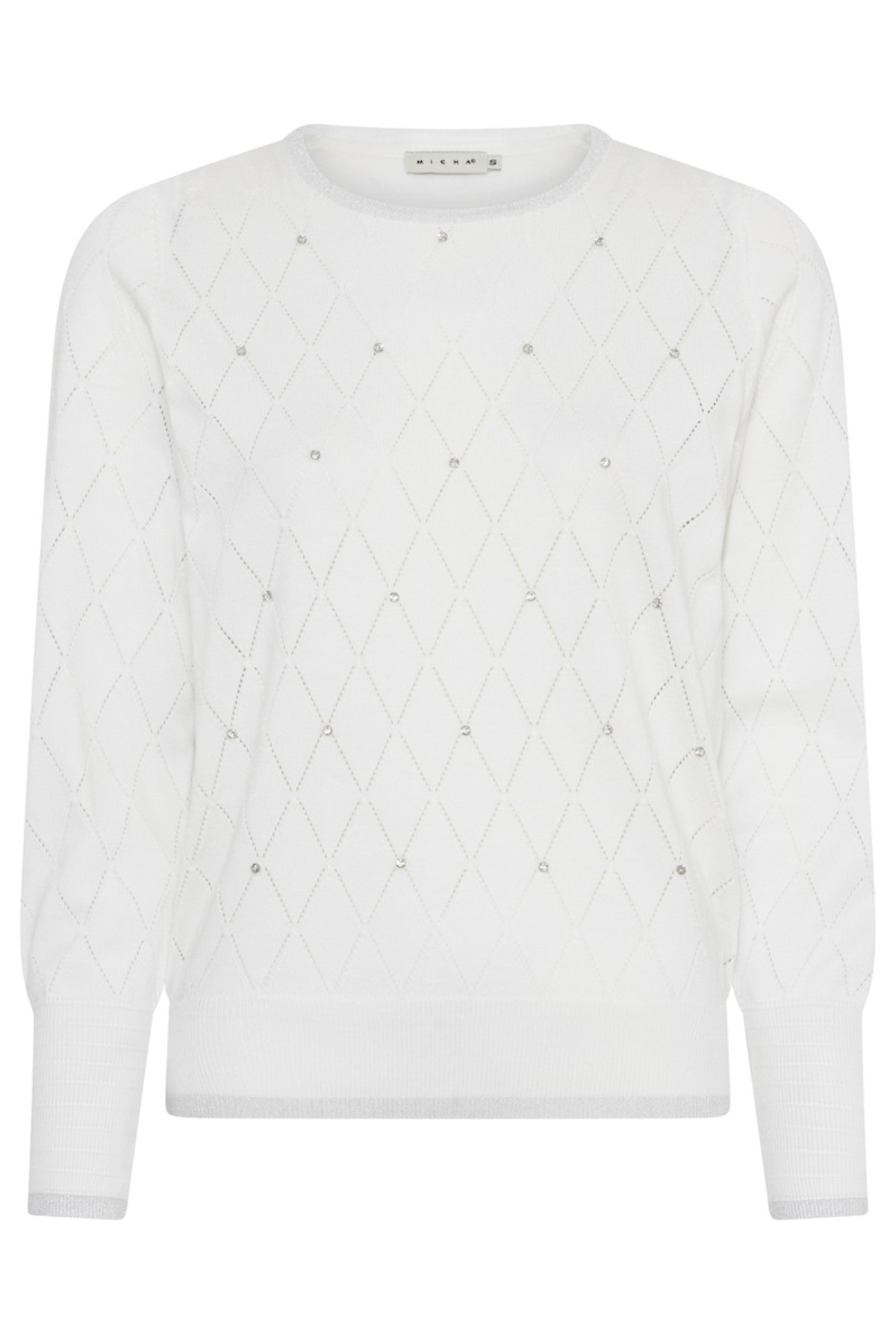 Micha Tröja Hamamatsu är en fin långärmad tröja från Micha med rund halsringning och fina påsydda strass-pärlor framtill. Tröjan är rak i skärningen och normal i passformen.