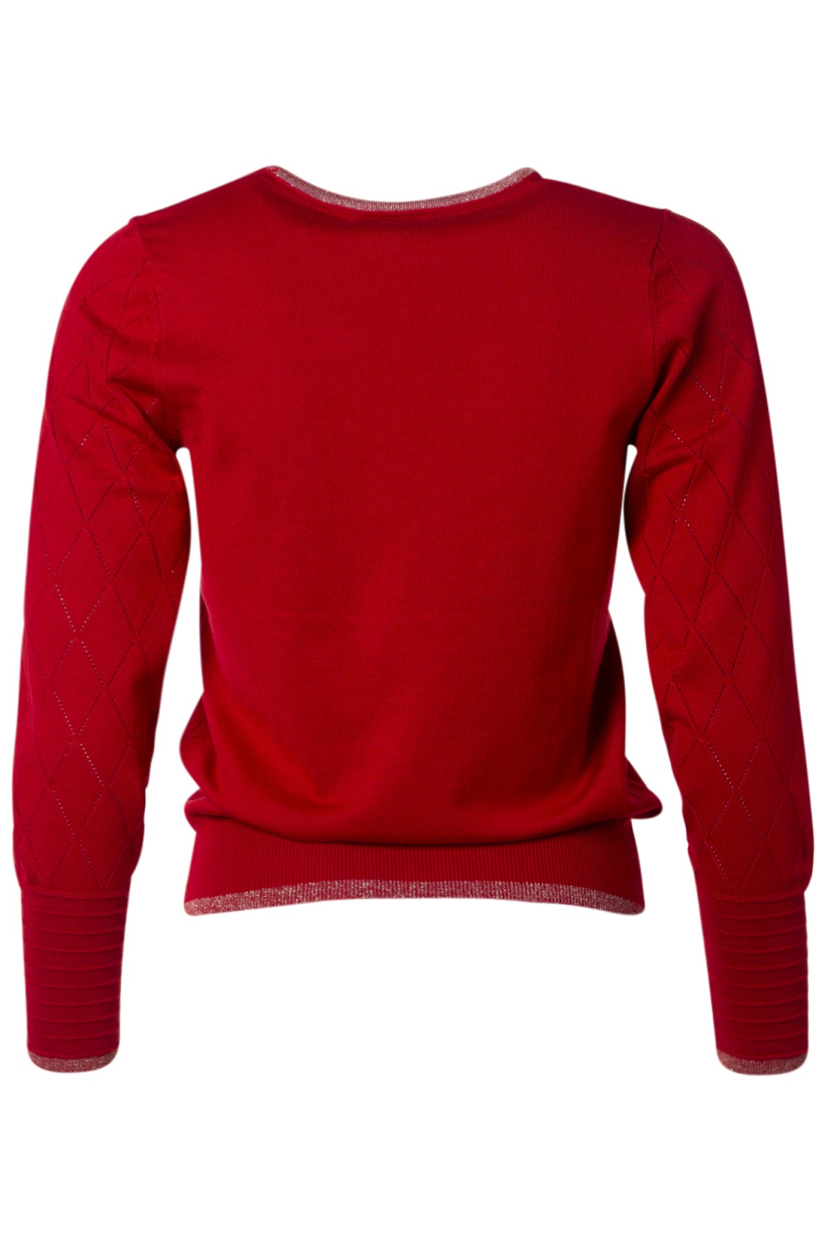 Den är dekorativt mönsterstickad med hålsöm i romber och den har avslutande muddar med diskret glittertråd. Tröjan är tillverkad av en mjuk och skön Viskos-mix.