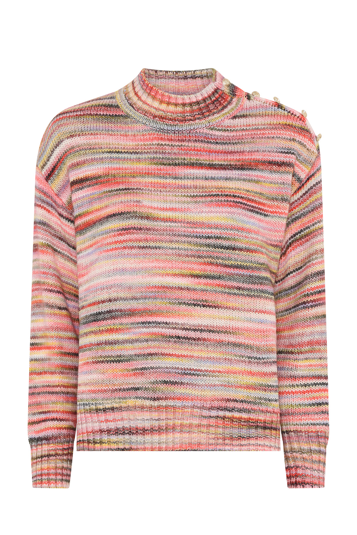 På vänster axel pryds tröjan av fem guldfärgade knappar som ger en elegant, men ändå lekfull detalj. Den raka passformen kompletteras av små sprund i sidorna som bidrar till en smickrande silhuett och extra rörelsefrihet.
