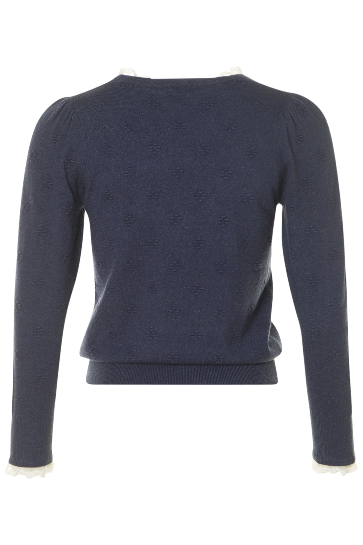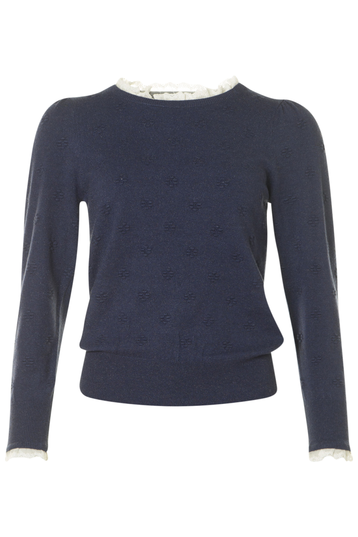 En fin strukturstickad tröja från Micha med lång ärm och rund halsringning med vit spetsvolang i kanter. Tröjan är rak i skärningen och normal i passformen. Tröjan är tillverkad av en mjuk och skön viskos-mix.