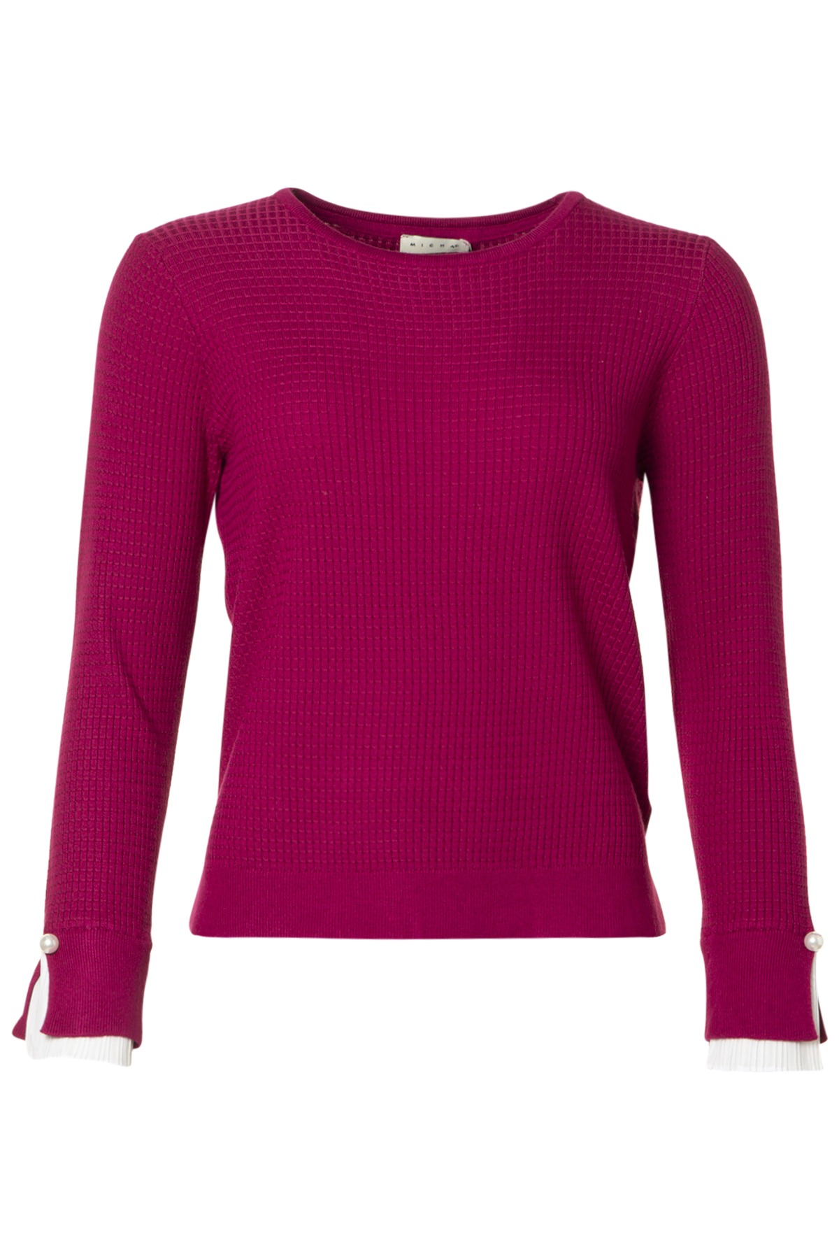 Micha Tröja Miryang är en fin långärmad tröja med rund halsringning. Tröjan är rak i modellen, normal i passformen och den är dekorativt mönsterstickad i små rutor. Tröjan har en fin detalj i ärmsluten med en vit plisserad kant och ett sprund med en pärlknapp. Den är tillverkad av en mjuk och skön viskosmix.