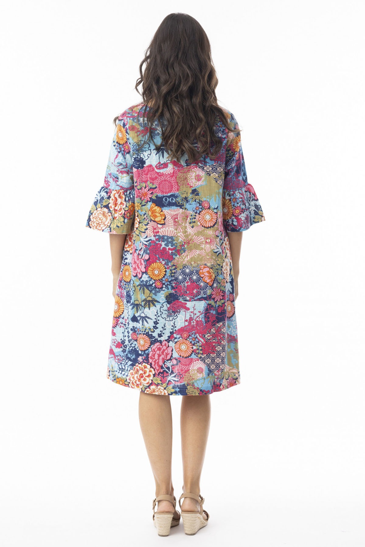 Ärmdetaljer: De karaktäristiska ärmarna i 3/4-längd avslutas med en generös volang, vilket ger plagget en feminin och lekfull karaktär.