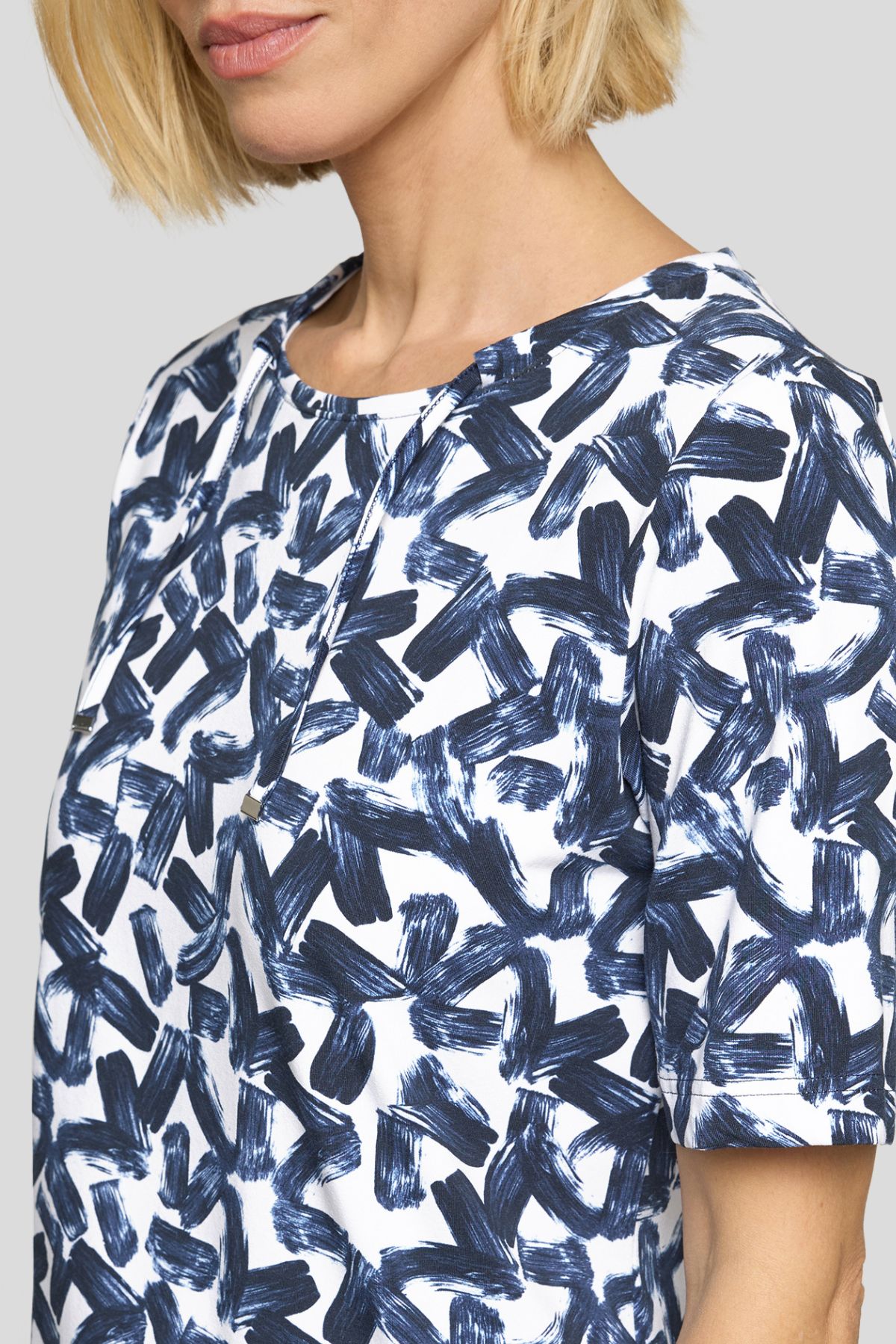 Toppen är designad med en rund halsringning som har en dekorativ dragsko med eleganta metallavslut vid ändarna – en subtil detalj som ger plagget en sportig men ändå lyxig touch. De korta ärmarna och den följsamma, mjuka kvaliteten säkerställer en bekväm passform som håller formen hela dagen. Rabe är välkända för sina högkvalitativa material och sin fantastiska komfort, och Topp Paint är ett utmärkt exempel på detta hantverk.