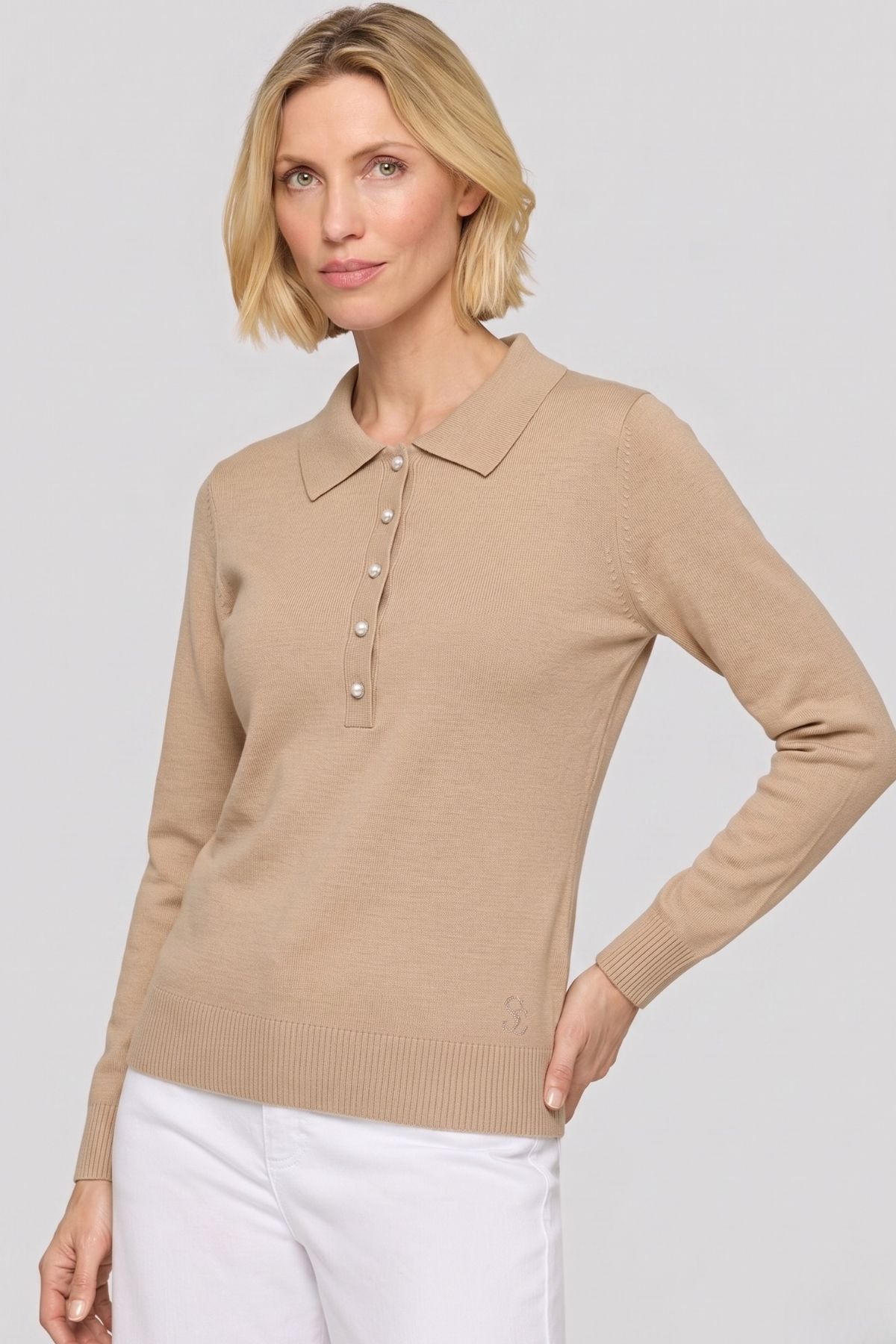 LE TOUQUET är en stilren och feminin stickad tröja från Simonsen Copenhagen. Med sin klassiska krage och eleganta pärlknappar ger den ett välklätt intryck som fungerar lika bra till vardags som till fest. Tröjan har en mjuk beige nyans och en exklusiv CS-logotyp i gnistrande stenar nertill som en extra detalj.