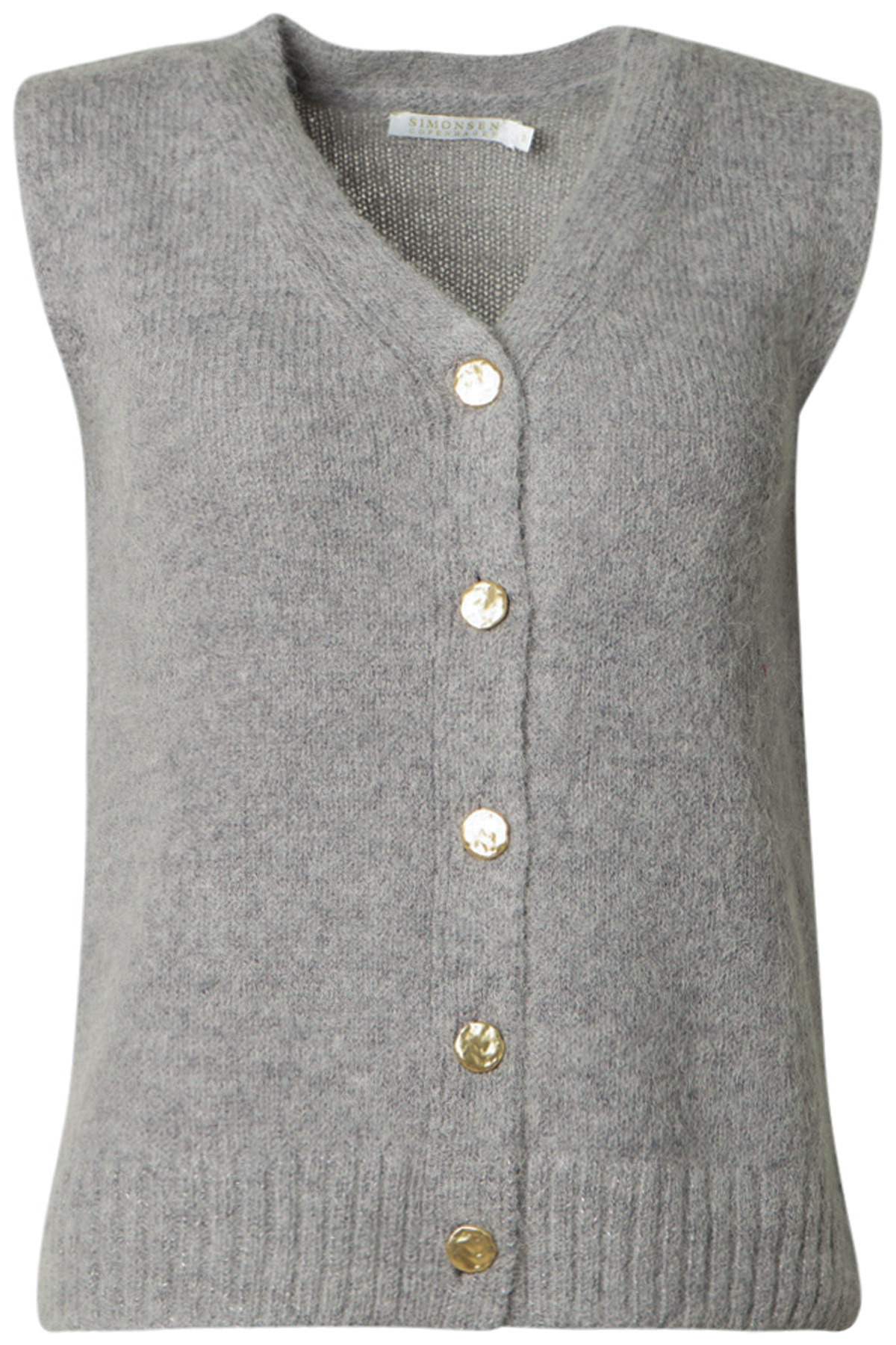 Simonsen Copenhagen Väst Måge, En elegant och värmande stickad väst i mjuk alpacka-ullmix. Den V-ringade modellen med rak silhuett och normal passform pryds av fem dekorativa guldfärgade knappar – en tidlös detalj som lyfter varje outfit. Västen har också en infälld diskret glittrig tråd i mudd nedtill. Perfekt att bära både till vardags och när du vill klä upp dig lite extra.