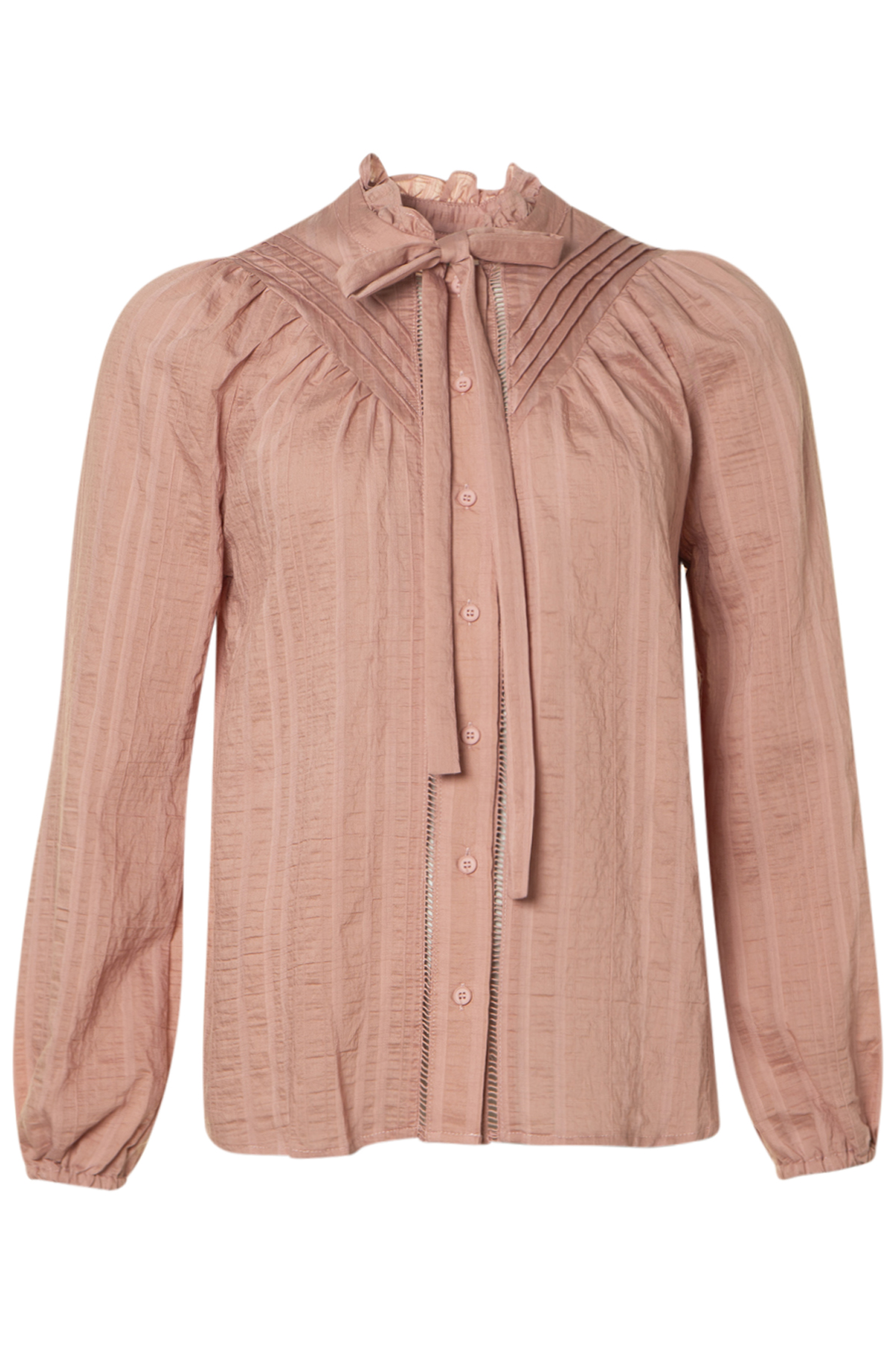 Soulmate Blus Bitten en vacker blus med rund hals och ståkrage med volang. Blusen har ett knytband fram i halsen och ett v-format ok med sydda stråveck. Den har sju knappar fram med dekorativa hålsömmar vid knappslån. Blusen har lång ärm med resår i ärmsluten, den är rak i modellen och ledig i passformen och har rak nederkant. Blusen är tillverkad av en härlig och lätt krinklad Lyocell-mix.