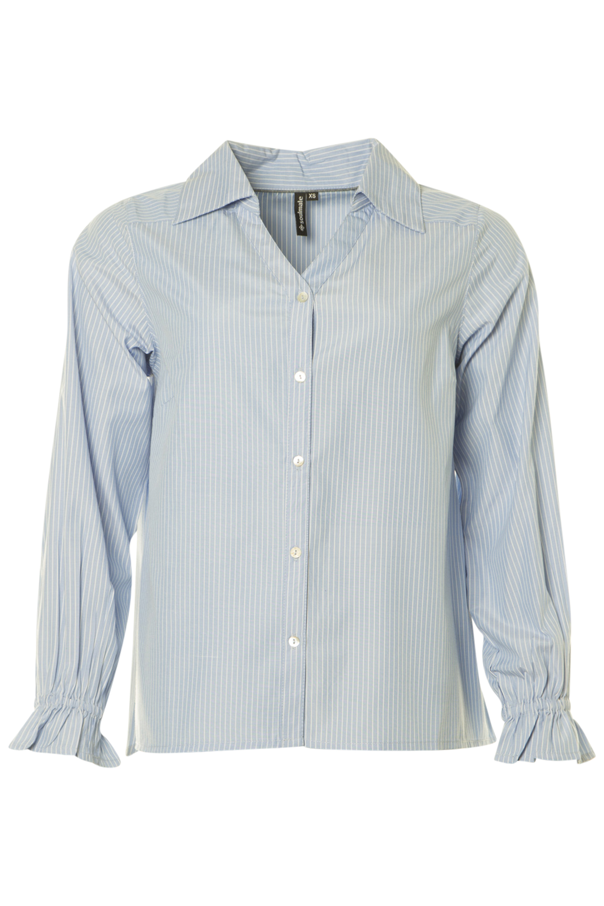 En klassisk randig blus från Soulmate med skjortkrage och v-ringning. Blusen är rak i modellen och vid i passformen.