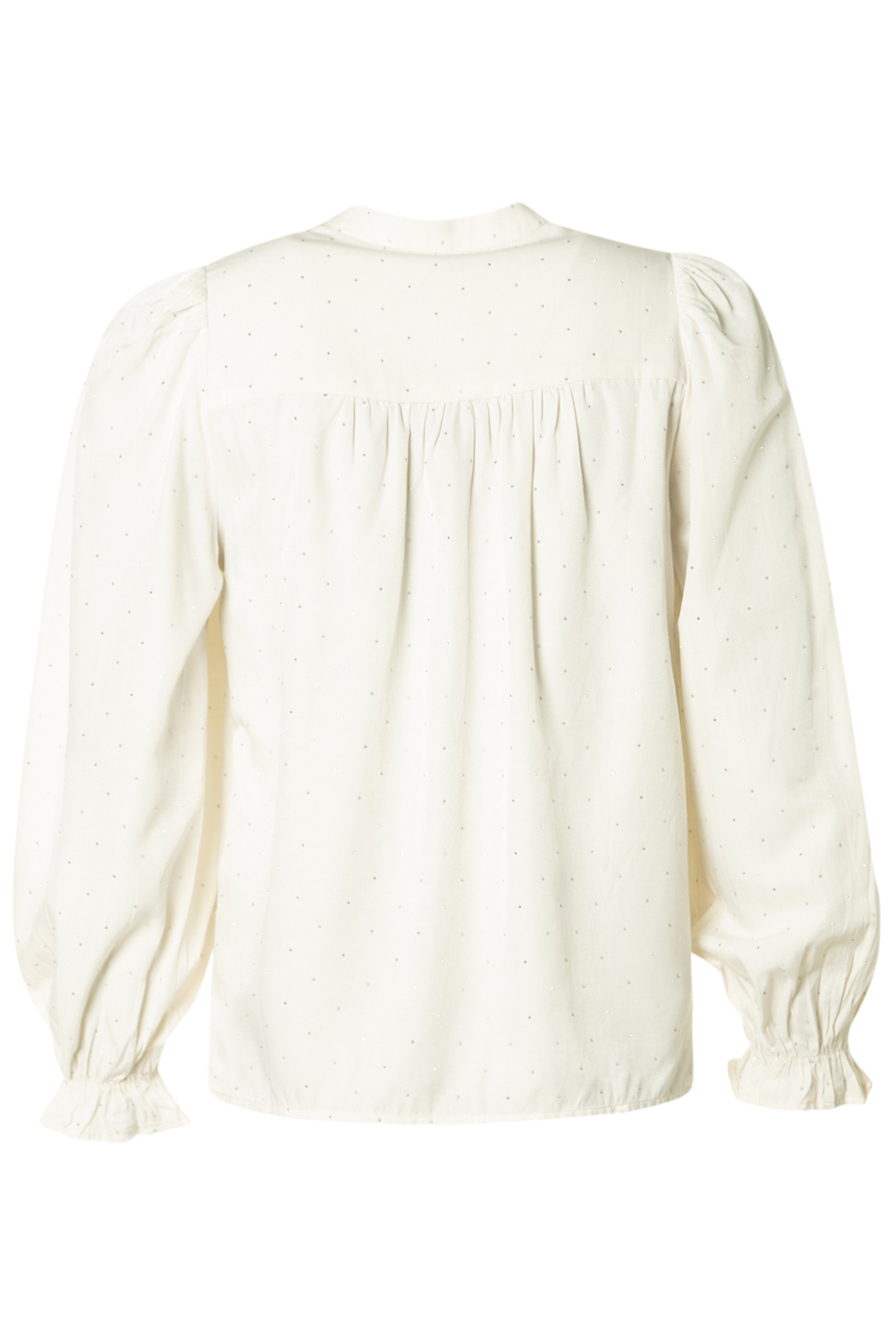 Soulmate Blus Dicte OffWhite är en elegant och glammig blus med rak silhuett, kort ståkrage och subtil puffärm som avslutas med volangresår för en smickrande och bekväm passform. Blusen pryds av små glitternitar som ger ett sofistikerat skimmer och lyfter looken – perfekt för festliga tillfällen.