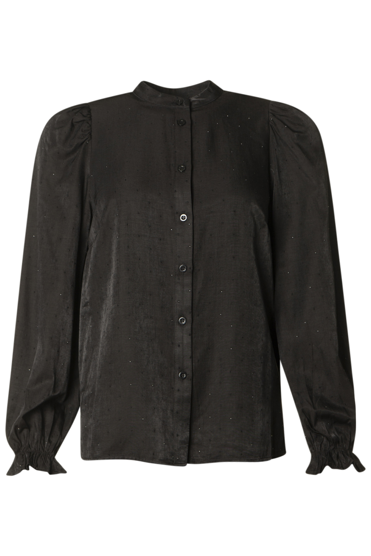Soulmate Blus Dicte Black är en elegant och glammig blus med rak silhuett, kort ståkrage och subtil puffärm som avslutas med volangresår för en smickrande och bekväm passform. Blusen pryds av små glitternitar som ger ett sofistikerat skimmer och lyfter looken – perfekt för festliga tillfällen.