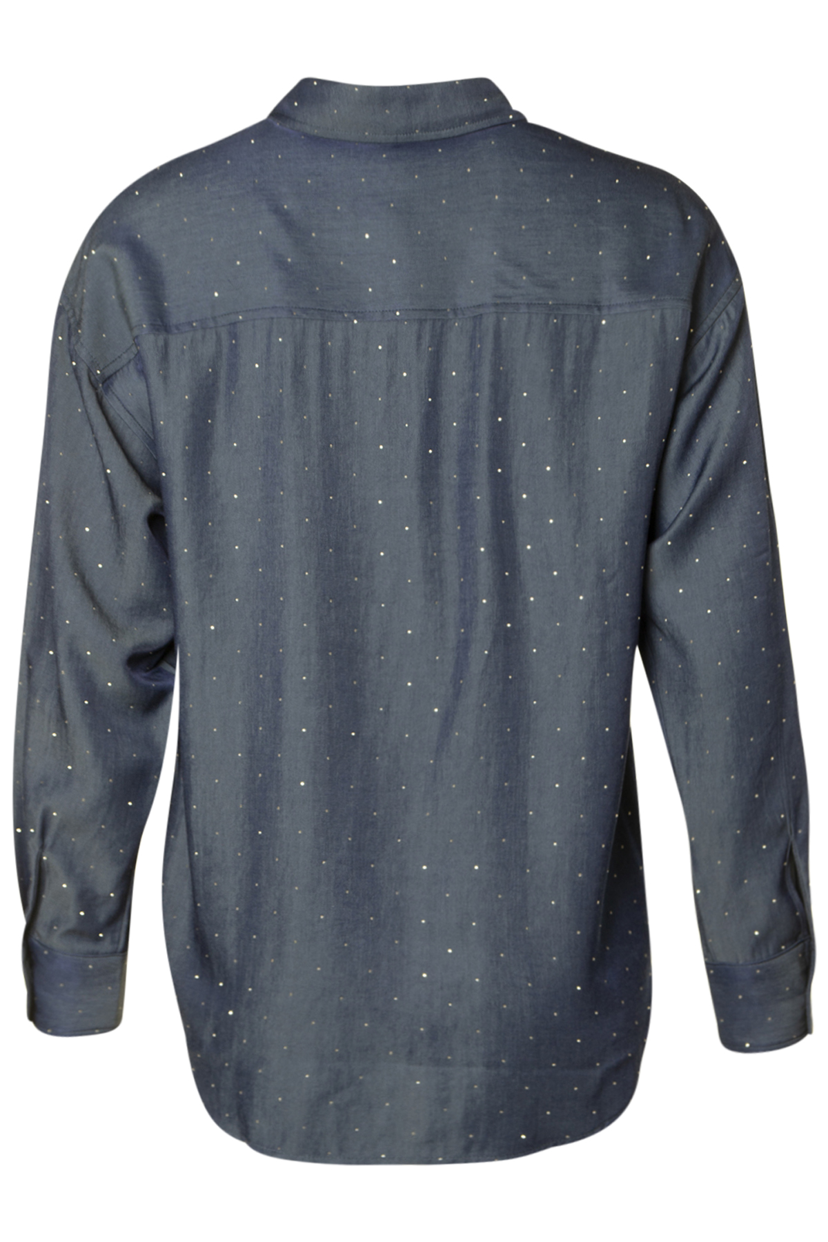 Soulmate Blus Ditte2 är en elegant blus i sidenmjuk, denimfärgad viskosmix, med små glittriga silverpärlor som ger en subtil lyster. Den har en klassisk skjortkrage, knäpps med sju knappar framtill och lång ärm med manschett... Läs mer...