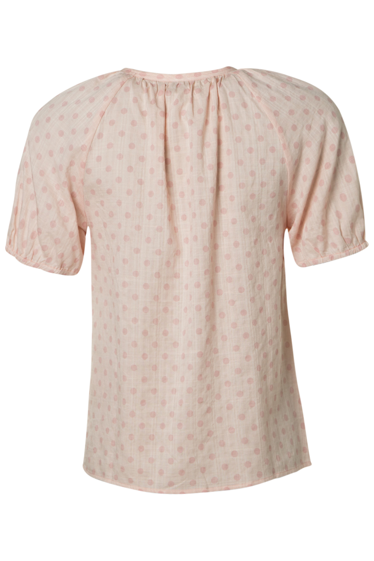 Soulmate Blus Juicy, är en fin blus med rund hals och ett sprund med en arbetad knappslå med lagda veck för en dold knäppning. Blusen är rak i skärningen och rymlig i passformen med korta raglan-ärmar med resår i nederkanten. Den har ett sött tryckt mönster med små prickar, tryckt på en sval bomull/viskos-kvalitet.