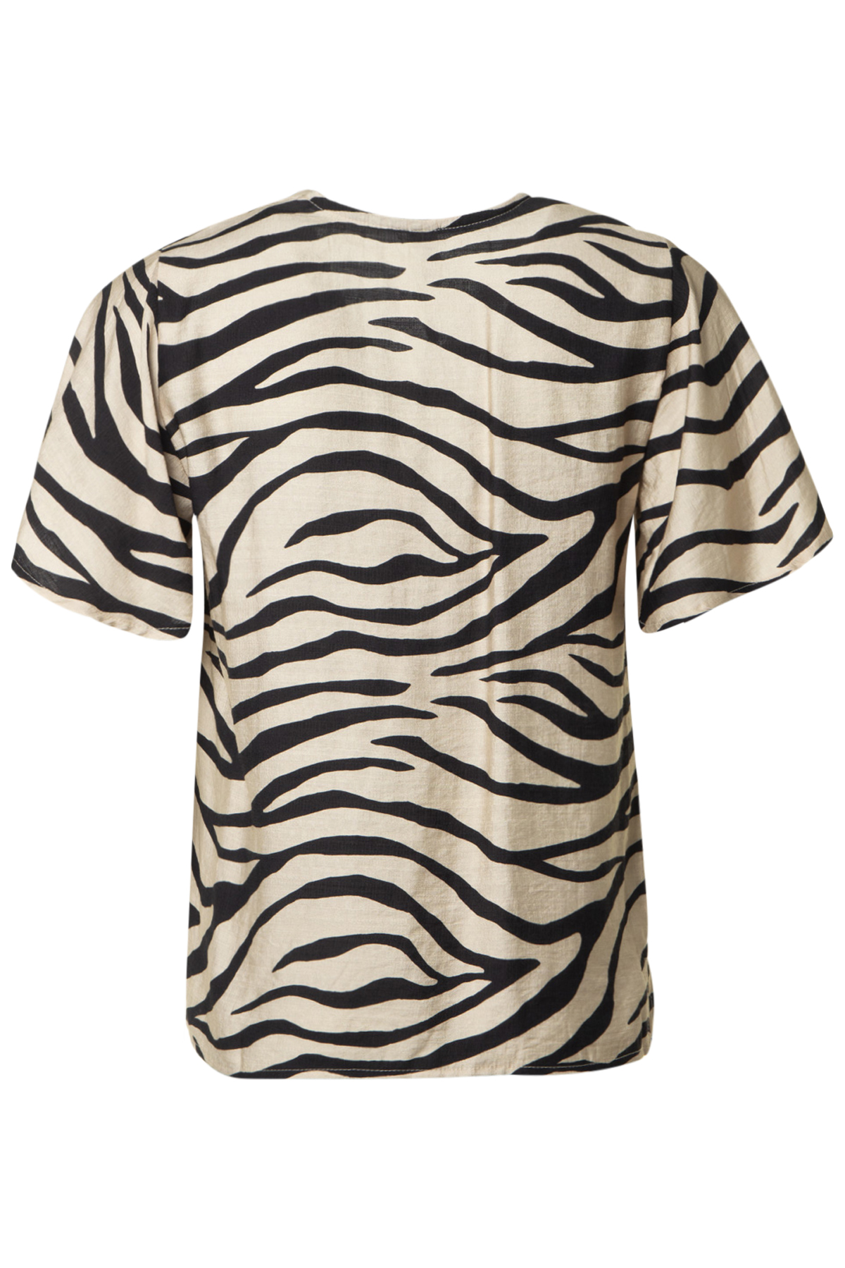 Soulmate Blus Zebra, en härlig blus med animal-print och sidenmjuk känsla. Blusen har V-ringad hals och korta trumpetärmar. Den är rak i modellen och ledig i passformen och har små sprund i sidsömmar.