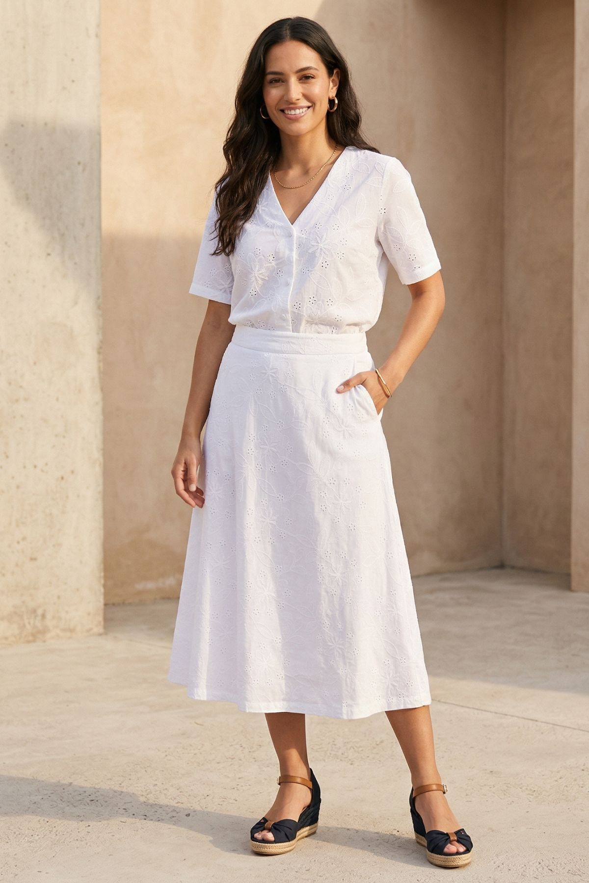 Detaljer: Vackert hålbroderi och funktionella snedställda fickor.
