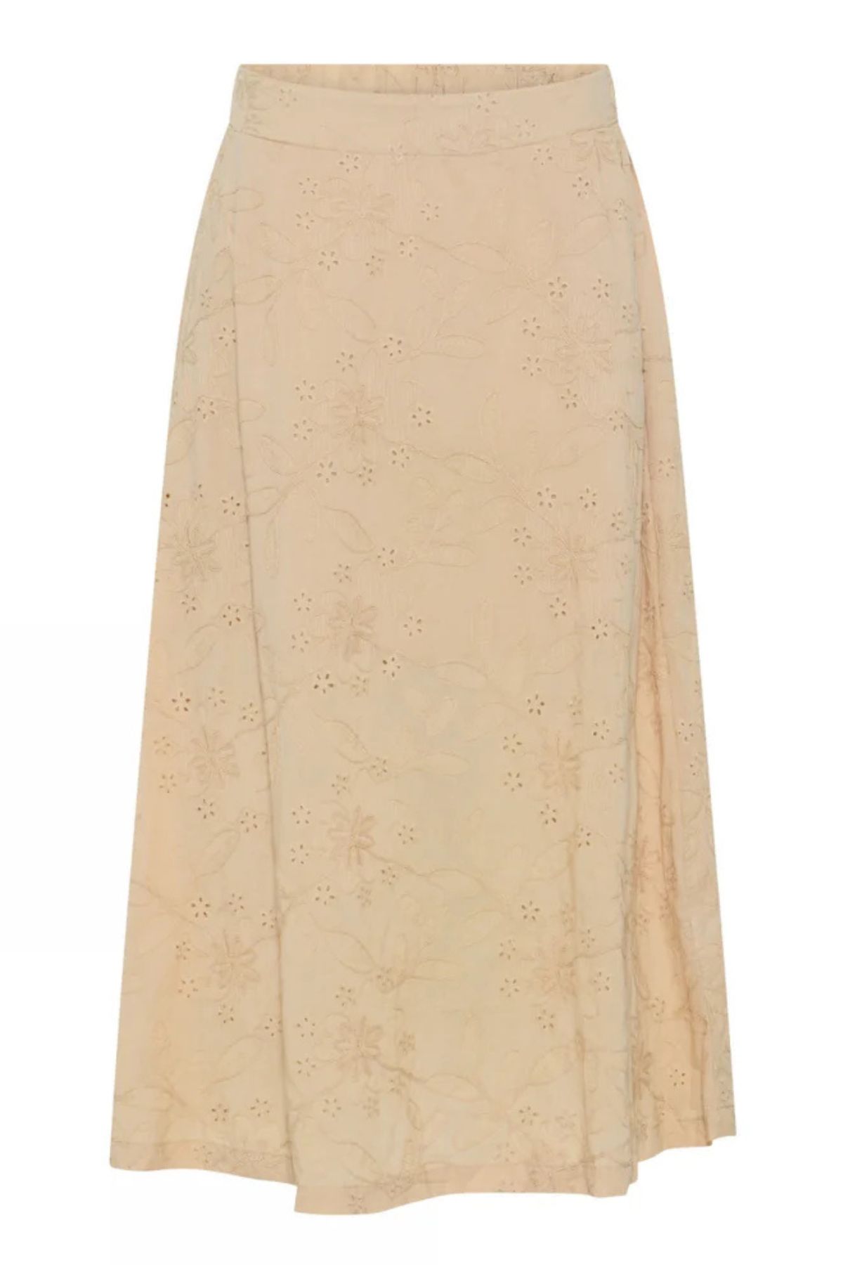 Upplev den feminina charmen hos Soulmate Kimira2, en vacker kjol tillverkad i 100% förstklassig bomull. Denna modell kombinerar ett romantiskt uttryck med funktionella detaljer, vilket gör den till ett självklart val för säsongens alla tillfällen. Kjolen pryds av ett delikat och genomgående hålbroderi som ger plagget en luftig och exklusiv känsla.