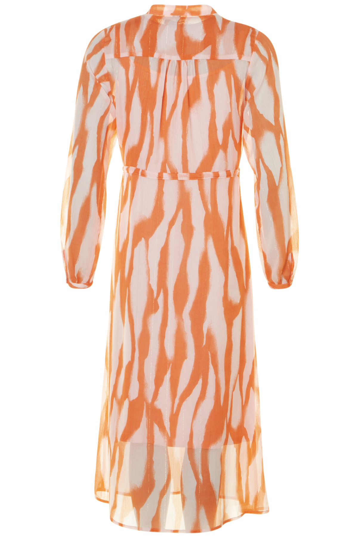 En härlig färgstark klänning från Soulmate med långa ärmar och smala manchetter med en knapp i ärmavsluten. Klänningen har rund hals med ståkrage och fem knappar fram till midjan. Den har en dragsko i midjan med ett smalt band som kan justeras. Klänningen har en underklänning med axelband i mjuk viskos. Den har smala glittriga ränder i mönstret på ytterklänningen.