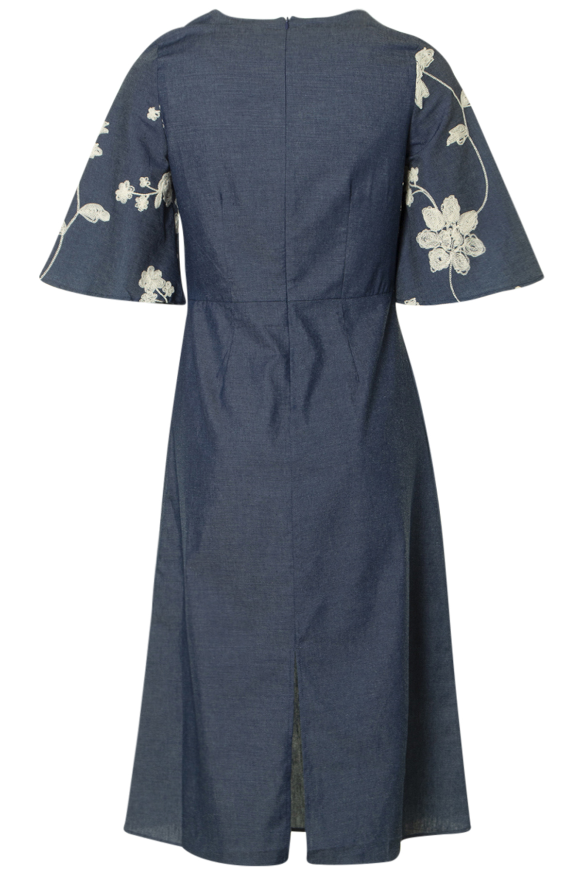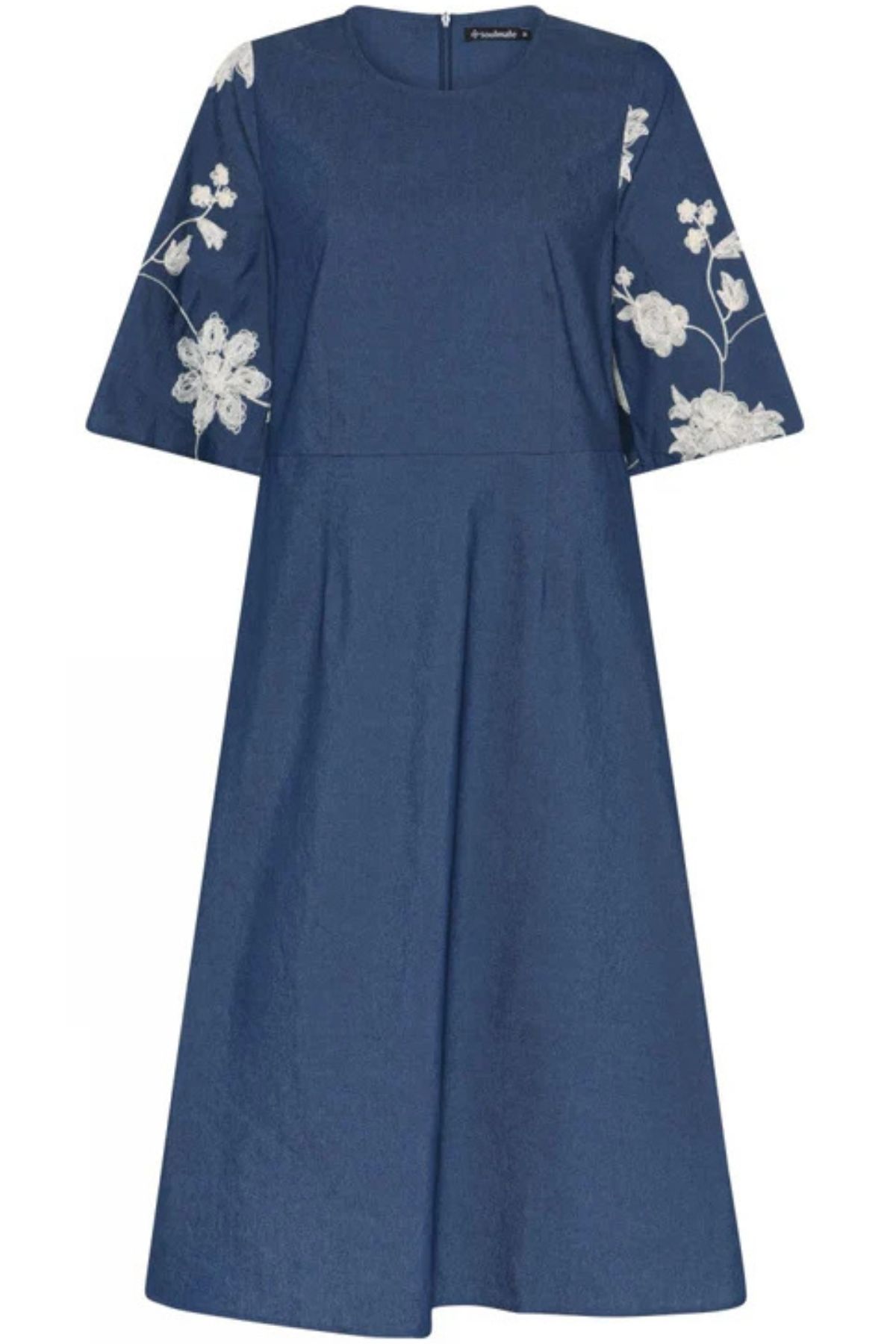 Soulmate Klänning Sumero är en elegant halvlång denim klänning med feminina detaljer och en smickrande silhuett. Klänningen har korta trumpetärmar med vackert broderi och en diskret dragkedja bak för en stilren avslutning.