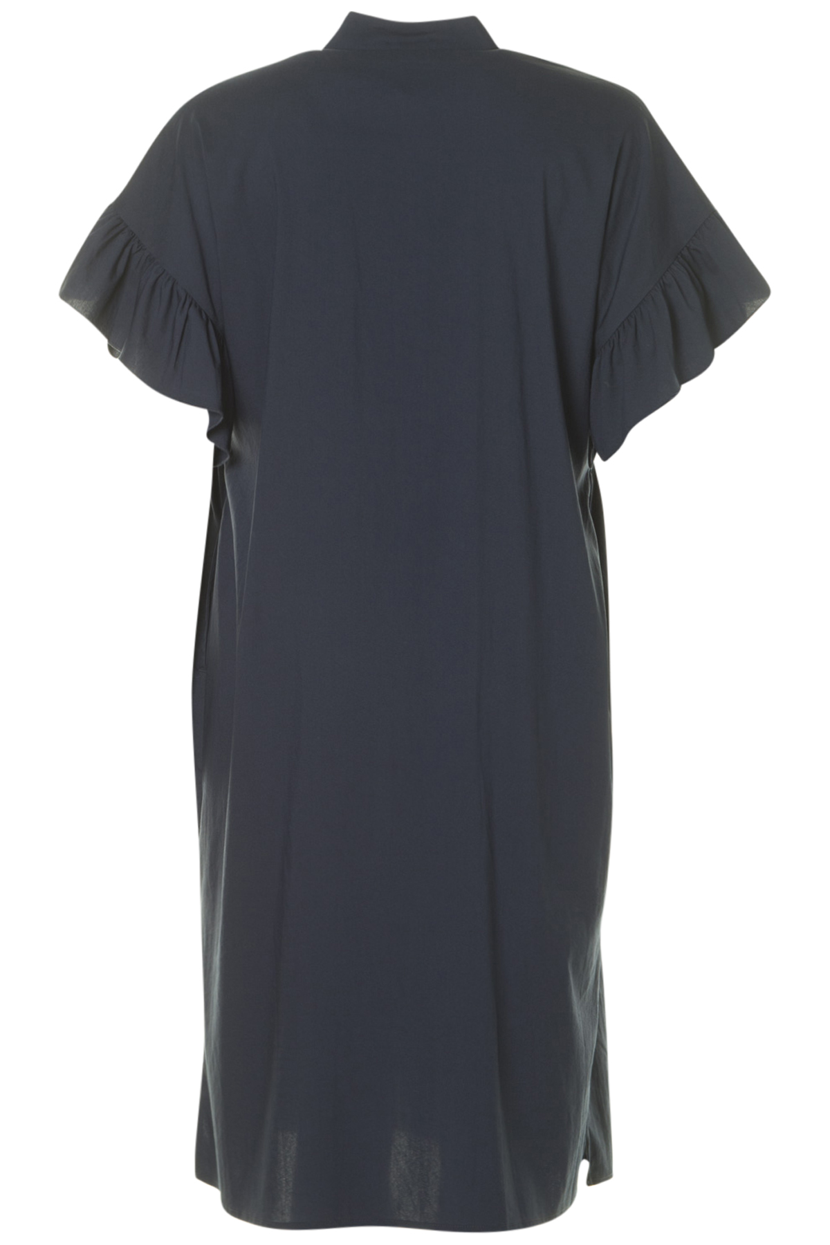 En härlig vid klänning med ståkrage och knäppning fram med sju fina guldfärgade knappar. Klänningen har volanger till ärmar, fickor i sidsömmarna och tillverkad i en sval mixkvalitet.