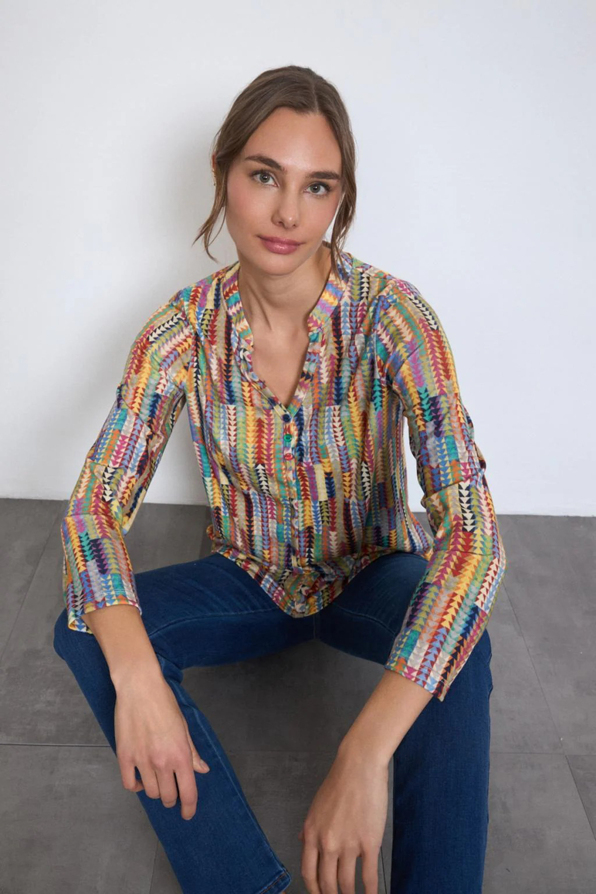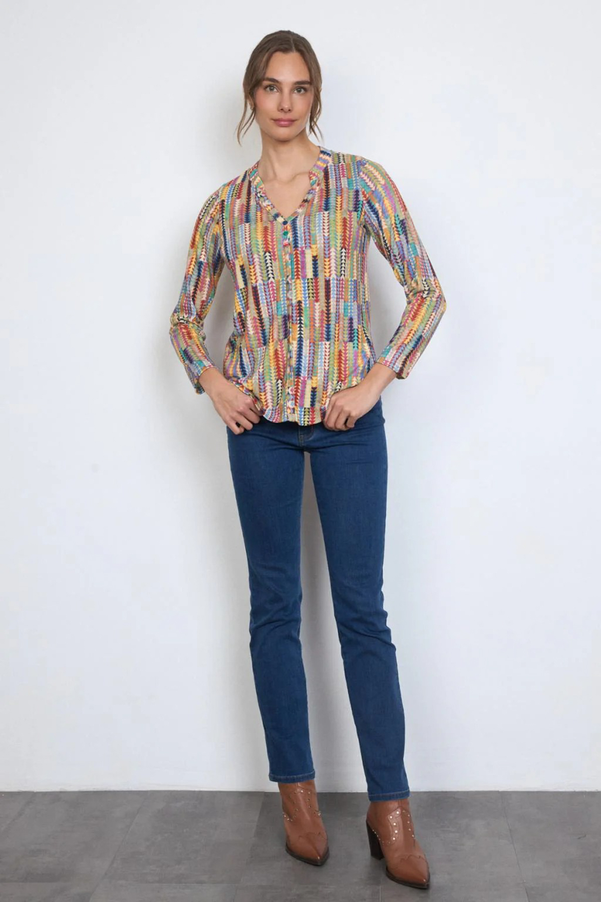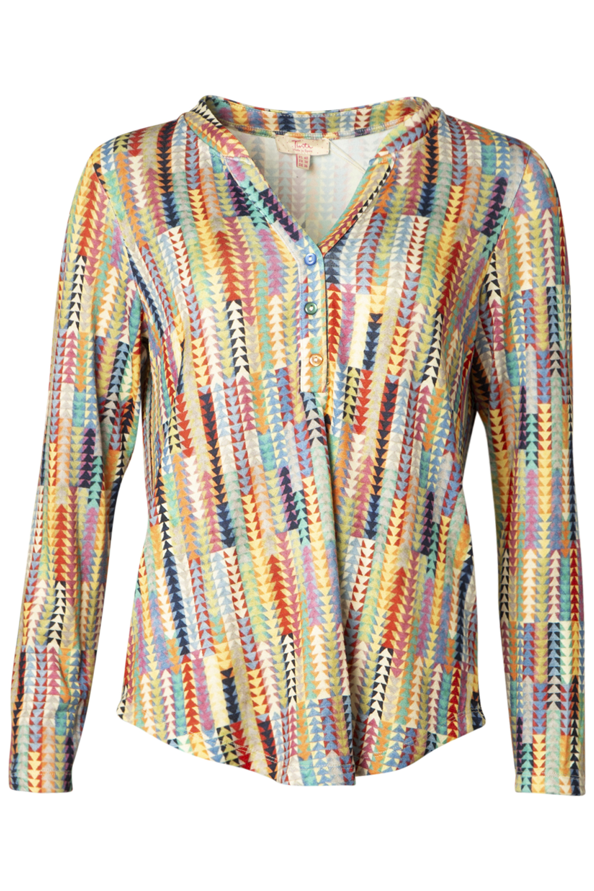Tinta Blus Caria är en färgstark blus med ett lekfullt mönster. Modellen har rund hals med smal ståkrage och ett sprund fram med tre knappar. Blusen är rak i modellen och ledig i passformen med med stretch, vilket gör den både bekväm och lätt att bära – perfekt för dig som vill ha en avslappnad men elegant look. Blusen har långa ärmar och är lätt rundad i nederkanten. Den är tillverkad i en supermjuk mix-kvalitet som känns behaglig mot huden och passar lika bra till vardags som till mer uppklädda tillfällen. Tinta Blus Caria – en mångsidig blus som kombinerar komfort och tidlös stil.