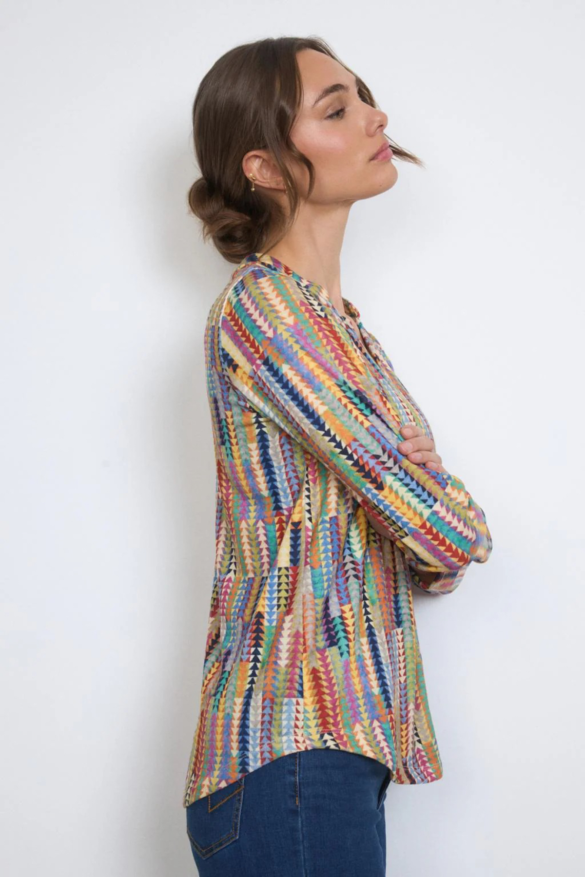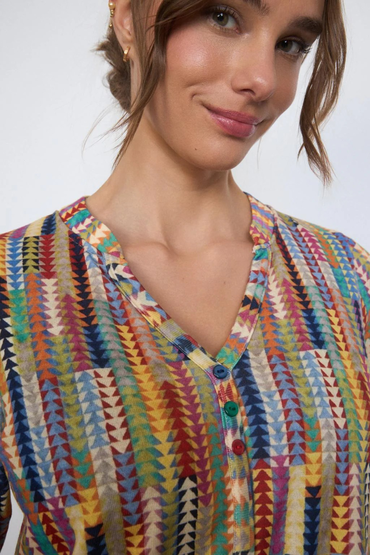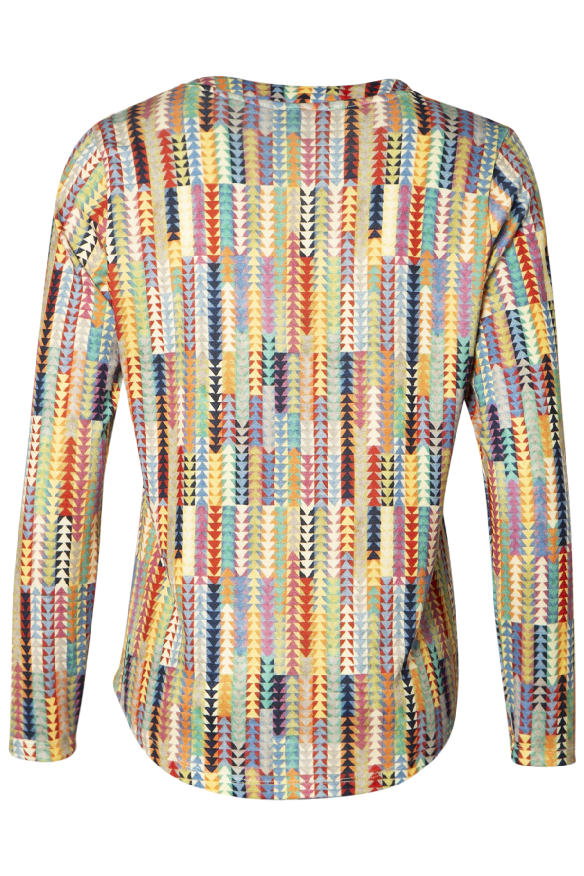 Tinta Blus Caria är en färgstark blus med ett lekfullt mönster. Modellen har rund hals med smal ståkrage och ett sprund fram med tre knappar. Blusen är rak i modellen och ledig i passformen med med stretch, vilket gör den både bekväm och lätt att bära – perfekt för dig som vill ha en avslappnad men elegant look. Blusen har långa ärmar och är lätt rundad i nederkanten. Den är tillverkad i en supermjuk mix-kvalitet som känns behaglig mot huden och passar lika bra till vardags som till mer uppklädda tillfällen. Tinta Blus Caria – en mångsidig blus som kombinerar komfort och tidlös stil.