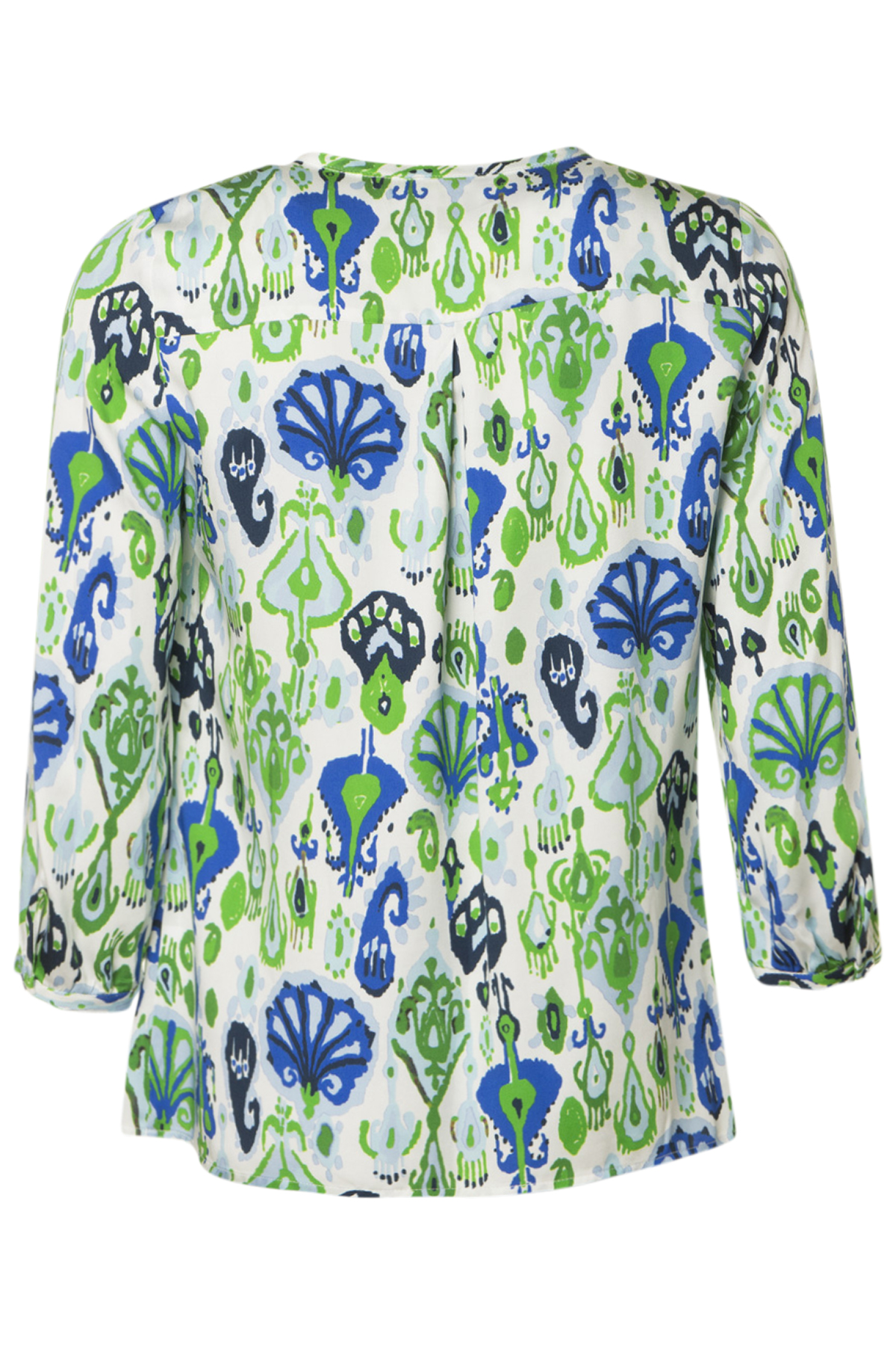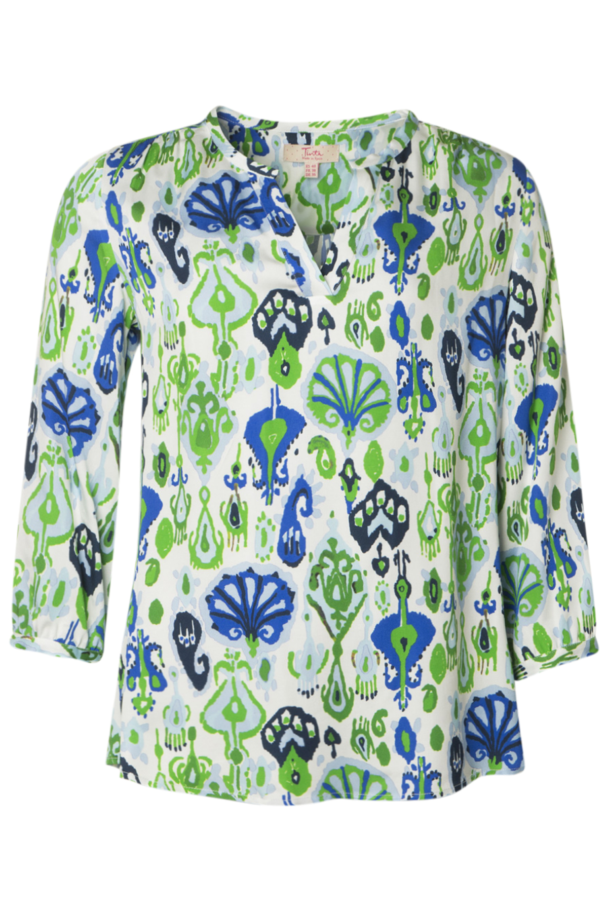 Tinta Blus Elene är en fin färgglad blus från Tinta med 3/4-ärm. Blusen är rak i modellen och rymlig i passformen med rund halsringning med smal ståkrage och V-ringat sprund fram.