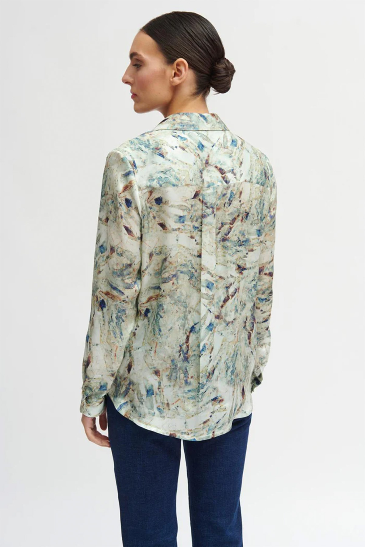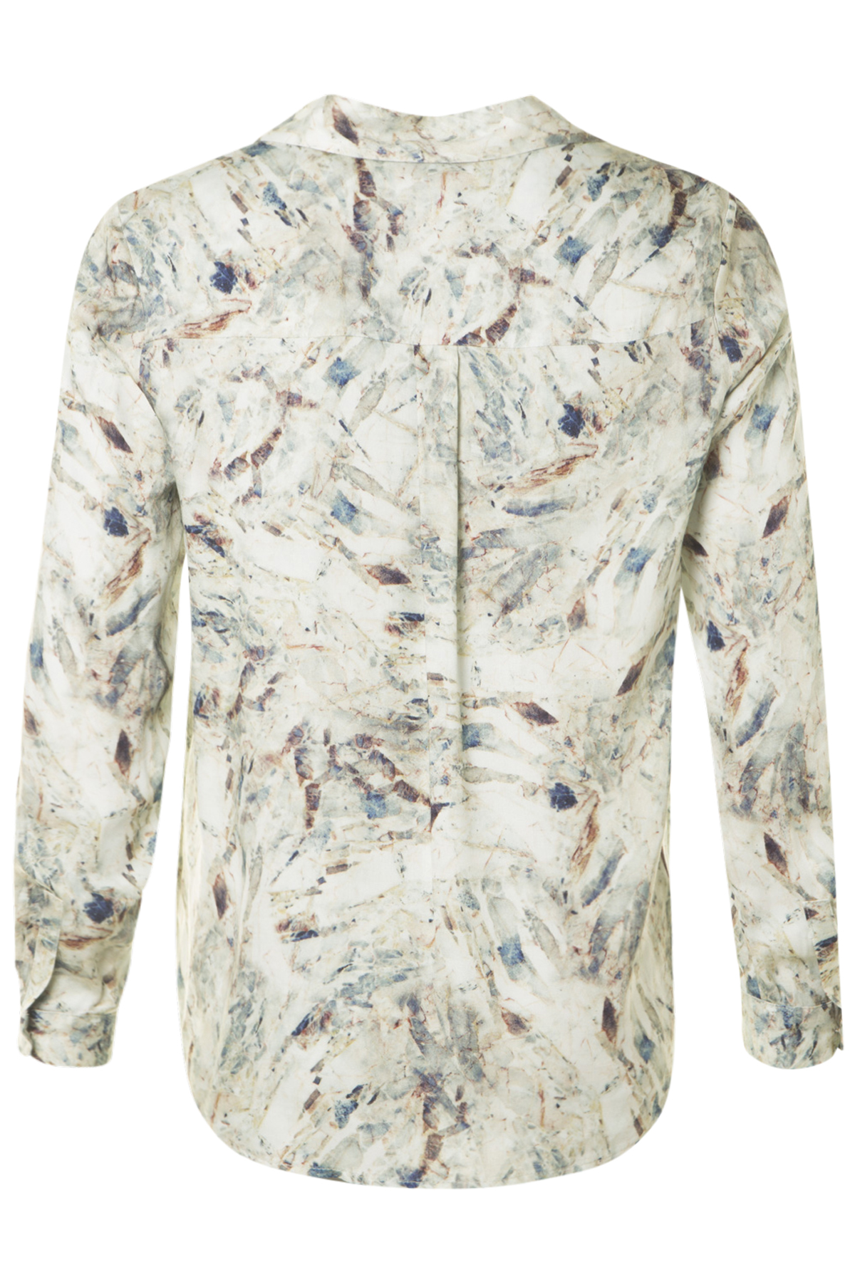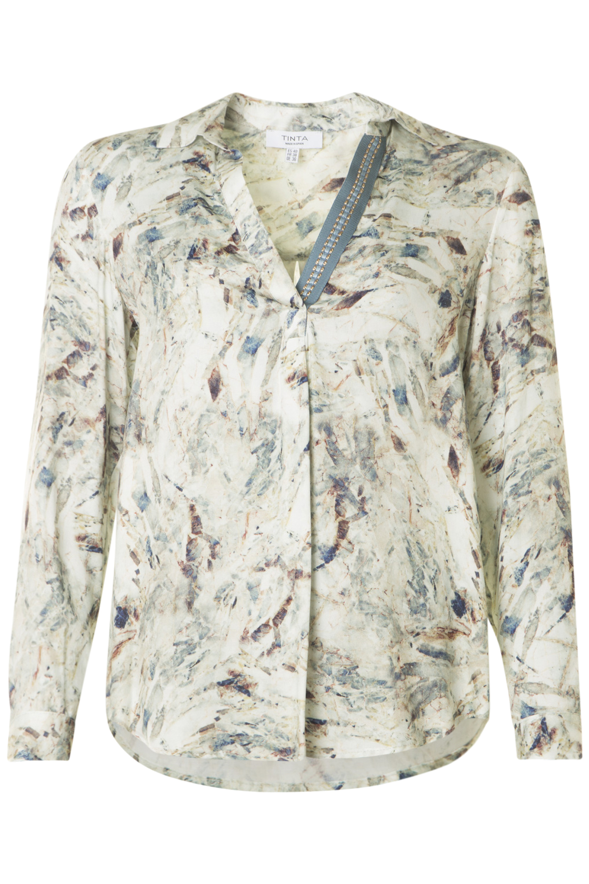 En snygg mönstrad blus med lång ärm från Tinta. Skjortan är rak i modellen och rymlig i passformen. Skjortan har klassisk krage och ett sprund fram med ett dekorativt påsytt band. Manschetterna i ärmsluten knäpps också med knapp.