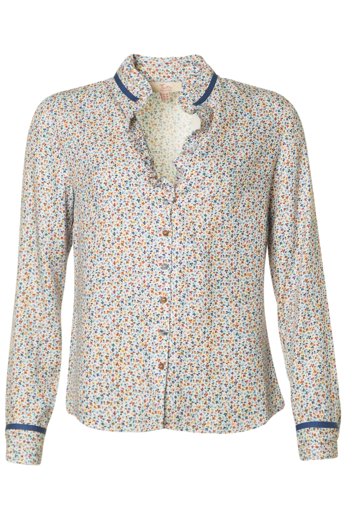 Tinta Blus Rita är en vacker blus med småblommigt mönster. Modellen är V-ringad med med sex dekorativa knappar fram och en liten volang och ett blått band runt ringningen. Den är figursydd i modellen och normal i passformen, vilket gör den lätt att stoppa i eller bära utanpå – perfekt för dig som vill ha en avslappnad men elegant look. Blusen har långa ärmar och smala manschetter med knapp i ärmsluten. Den är tillverkad i en supermjuk viskos som känns behaglig mot huden och passar lika bra till vardags som till mer uppklädda tillfällen. Tinta Blus Rita en mångsidig blus som kombinerar komfort och tidlös stil.