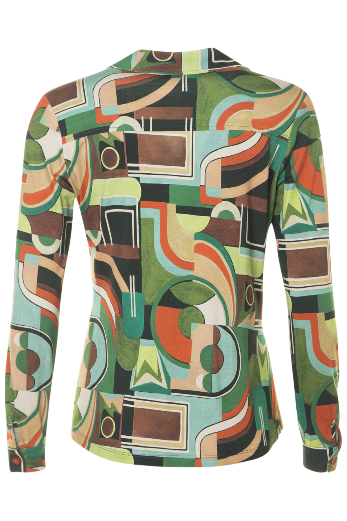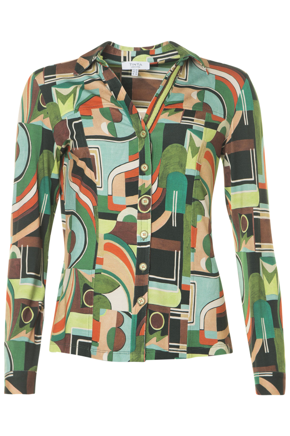 En snygg skjorta i lekfullt mönster från Tinta med lång ärm. Skjortan är något figursydd i modellen och normal i passformen. Skjortan har klassisk krage och en V-ringning med ett dekorativt band och knäpps med fem knappar framtill. Manschetterna i ärmsluten knäpps också med knapp.