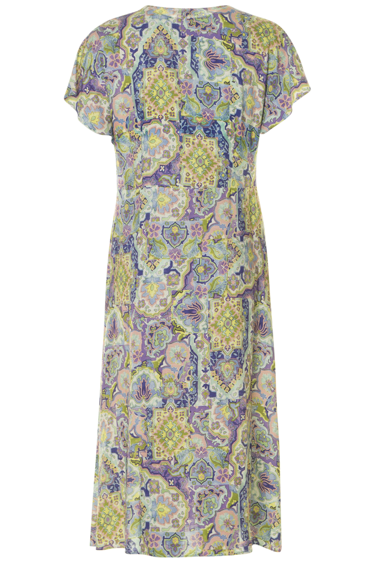 V-ringad klänning från Tinta Style med holkärm. Klänningen är något figursydd i modellen med lite mer vidd nertill med vackert fall. Den är avskuren i midjan och har nio knappar fram och fickor i sidsömmar.