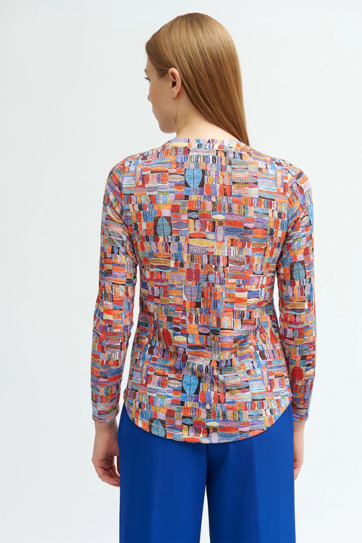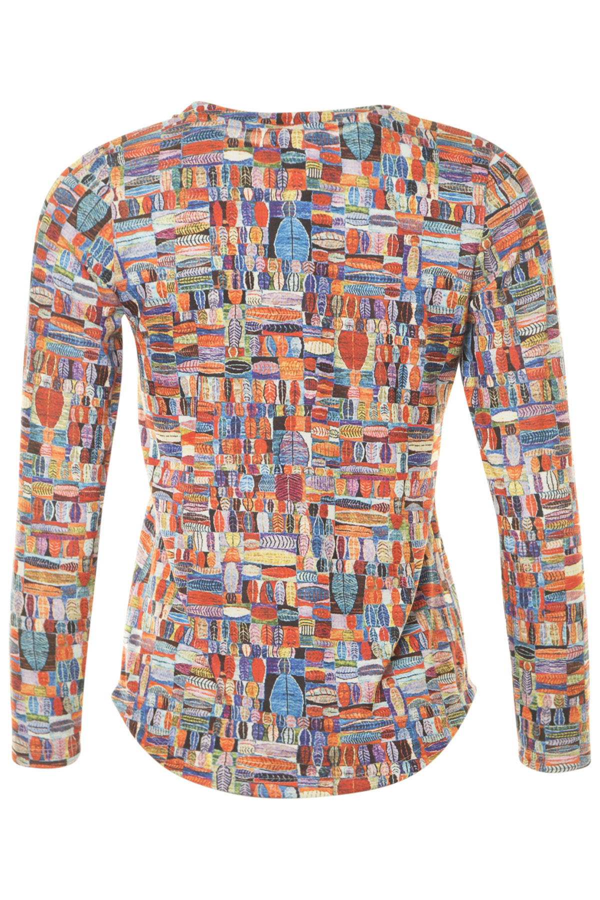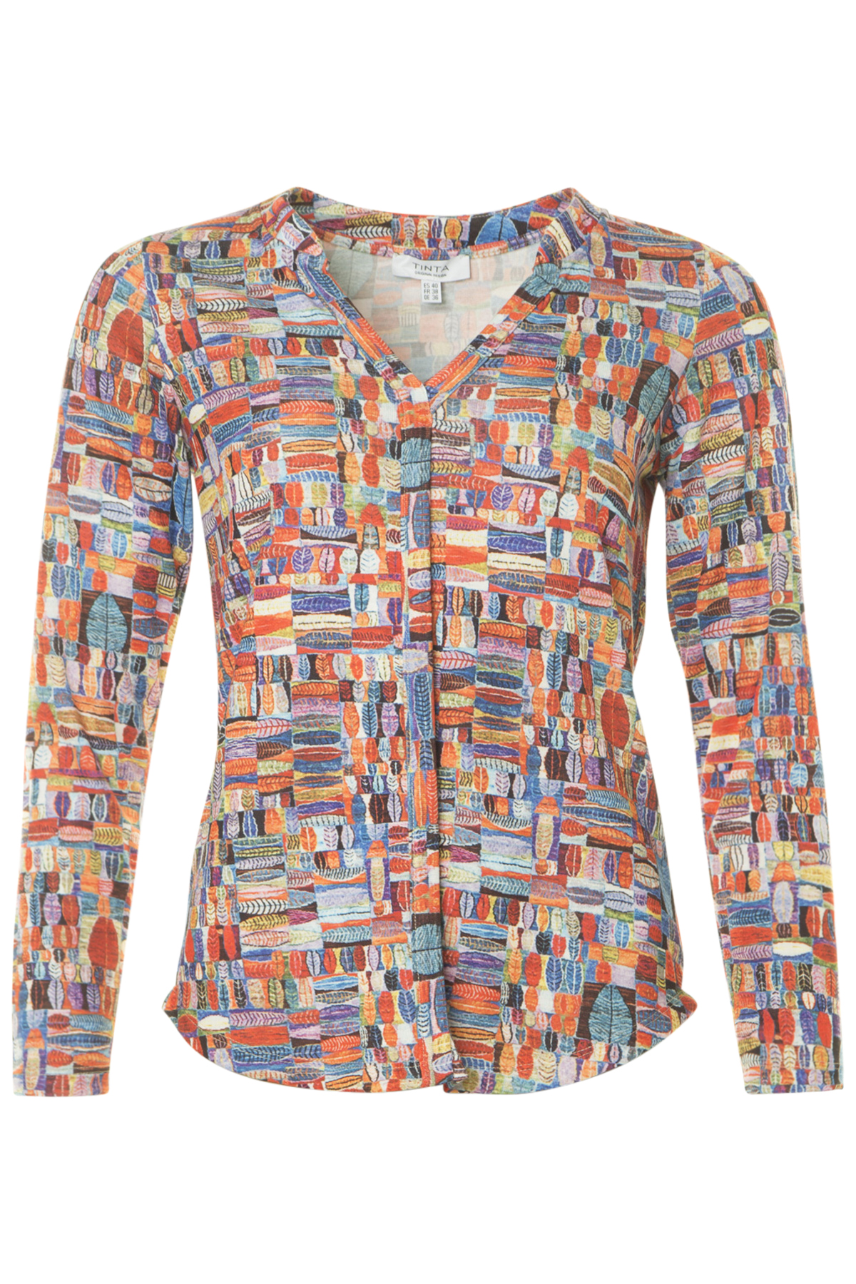En härlig färgstark topp från Tinta/Bariloche. Toppen är V-ringad, rak i modellen och normal i passformen. Den har ett sytt veck mitt fram och är något rundad i nederkanten och är tillverkad av en mjuk, stretchig mix-kvalitet.