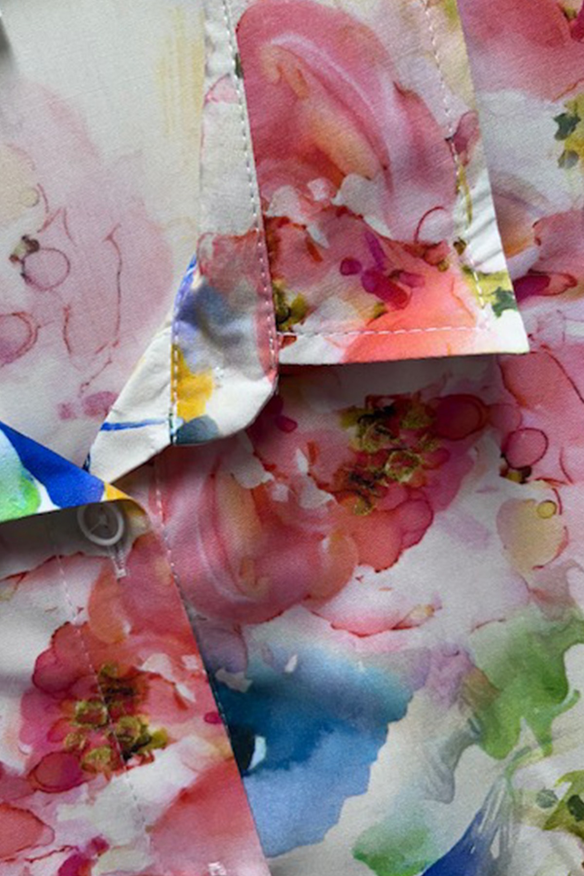 Låt stilen blomstra med Victoria Blus Hollis, en fantastisk skjortblus som kombinerar konstnärlig design med hög kvalitet. Blusen pryds av ett levande, akvarelliknande blommönster i en härlig mix av korall, rosa, blått och gult mot en ljus bas. Detta är ett plagg som sprider glädje och ger din outfit en omedelbar färgklick.